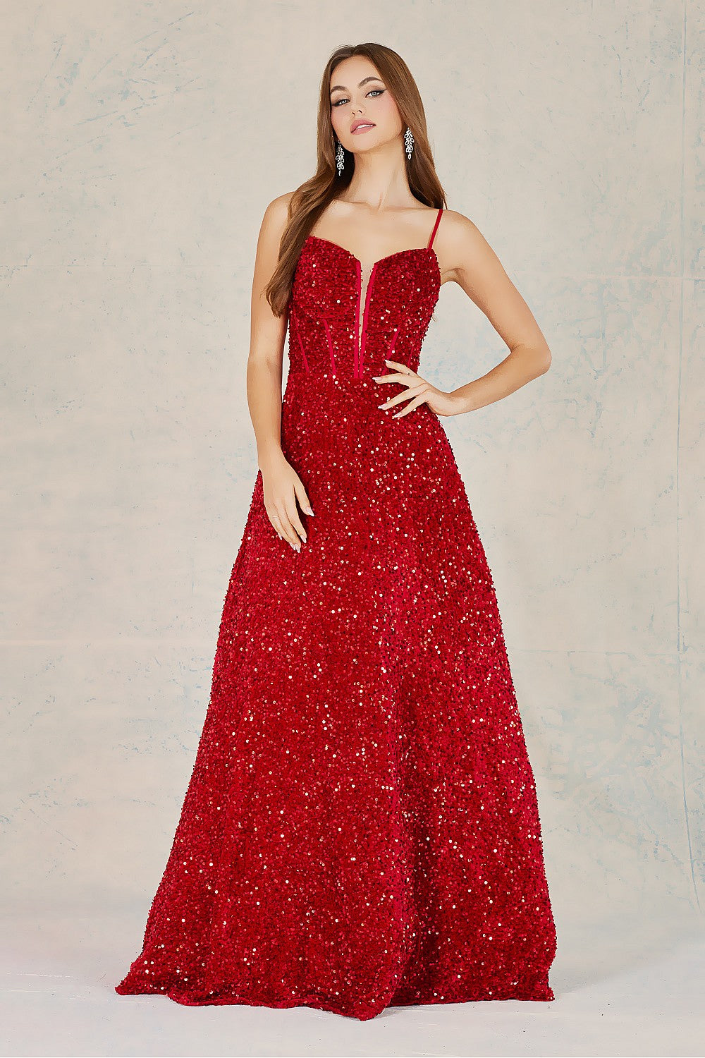 The Adora 3139 Dress is a stunning long gown designed to make you feel absolutely radiant. Featuring an elegant sweetheart neckline and delicate spaghetti straps, this sleeveless beauty showcases luxurious sequin fabric that catches the light beautifully with every movement. The shimmering sequins create a unique, eye-catching sparkle that sets you apart at any special occasion. Perfect for proms, galas, or formal events, this dress combines timeless sophistication with modern glamour. You'll love how the flowing silhouette flatters your figure while the dazzling embellishments ensure all eyes are on you. Embrace your confidence in this show-stopping gown.