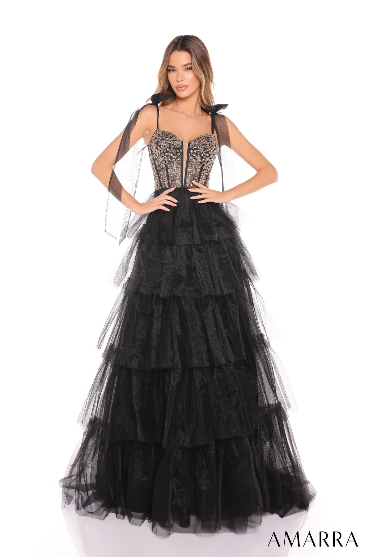 Step into a dream with the Amarra 88331 Dress, a playful ruffle tulle A-line gown featuring a sparkling beaded bodice and a sweetheart neckline. Delicate bow straps add whimsical charm to the sleeveless design, while cascading tiers of ruffled tulle create movement and depth. The floor-length skirt flows gracefully, and a lace-up back ensures a perfect, customizable fit—ideal for making a romantic and elegant statement at any formal occasion.