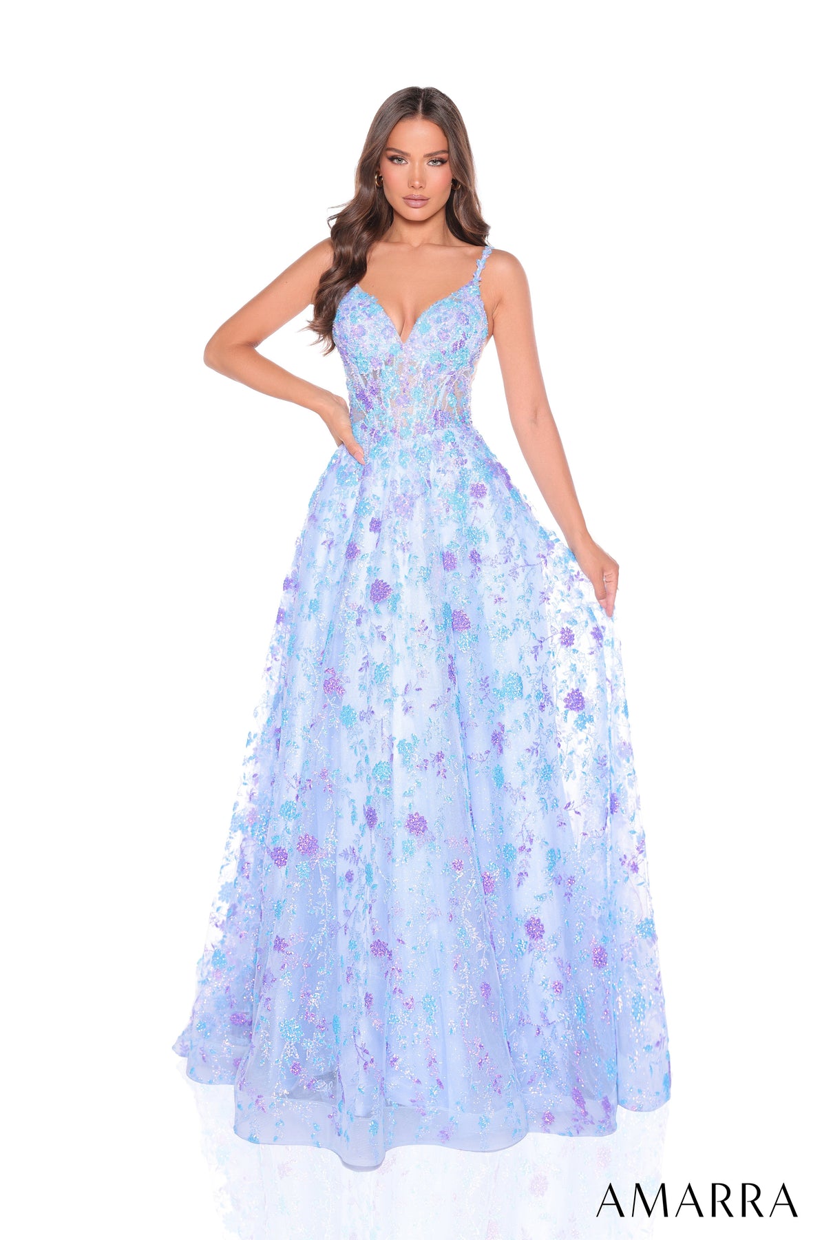 Add a touch of magic to your special occasion with the Amarra 88362 Dress. This dazzling ball gown features all-over sequin embellishments that catch and reflect light, creating a stunning effect. The plunging V-neckline and sleeveless design exude allure, while the voluminous skirt and sheer side panels add a touch of sensuality. With a lace-up closure for the perfect fit, this gown will make you shine all night long.