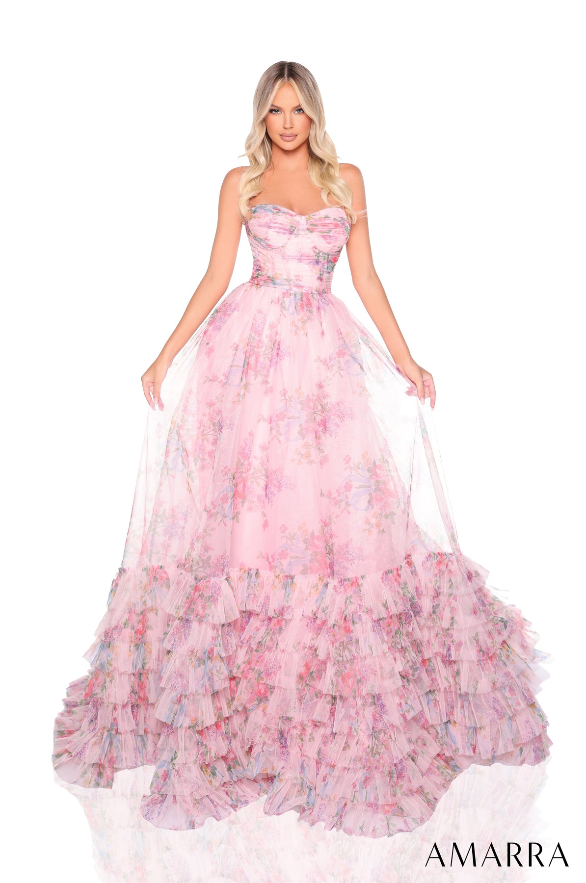 Step into a dream with the Amarra 88381 Dress, a playful ruffle tulle ball gown in soft pink adorned with delicate floral prints. Featuring a strapless semi-sweetheart neckline and a structured pleated bodice, this gown flares into a voluminous skirt with cascading ruffled layers that float like clouds. The lace-up back ensures a perfect fit, making this enchanting dress perfect for a whimsical and unforgettable celebration.