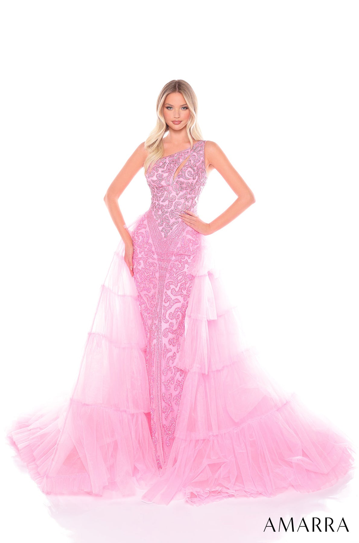 Turn heads in the Amarra 88147 Dress, designed to dazzle with its sparkly one-shoulder silhouette and playful asymmetrical neckline. The fitted bodice sparkles with intricate beaded details, while the detachable ruffled tulle overskirt adds a fun, dramatic flair from behind. Switch between sleek elegance and show-stopping volume for two stunning looks in one dress. Perfect for twirling through formal evenings with confidence and charm.