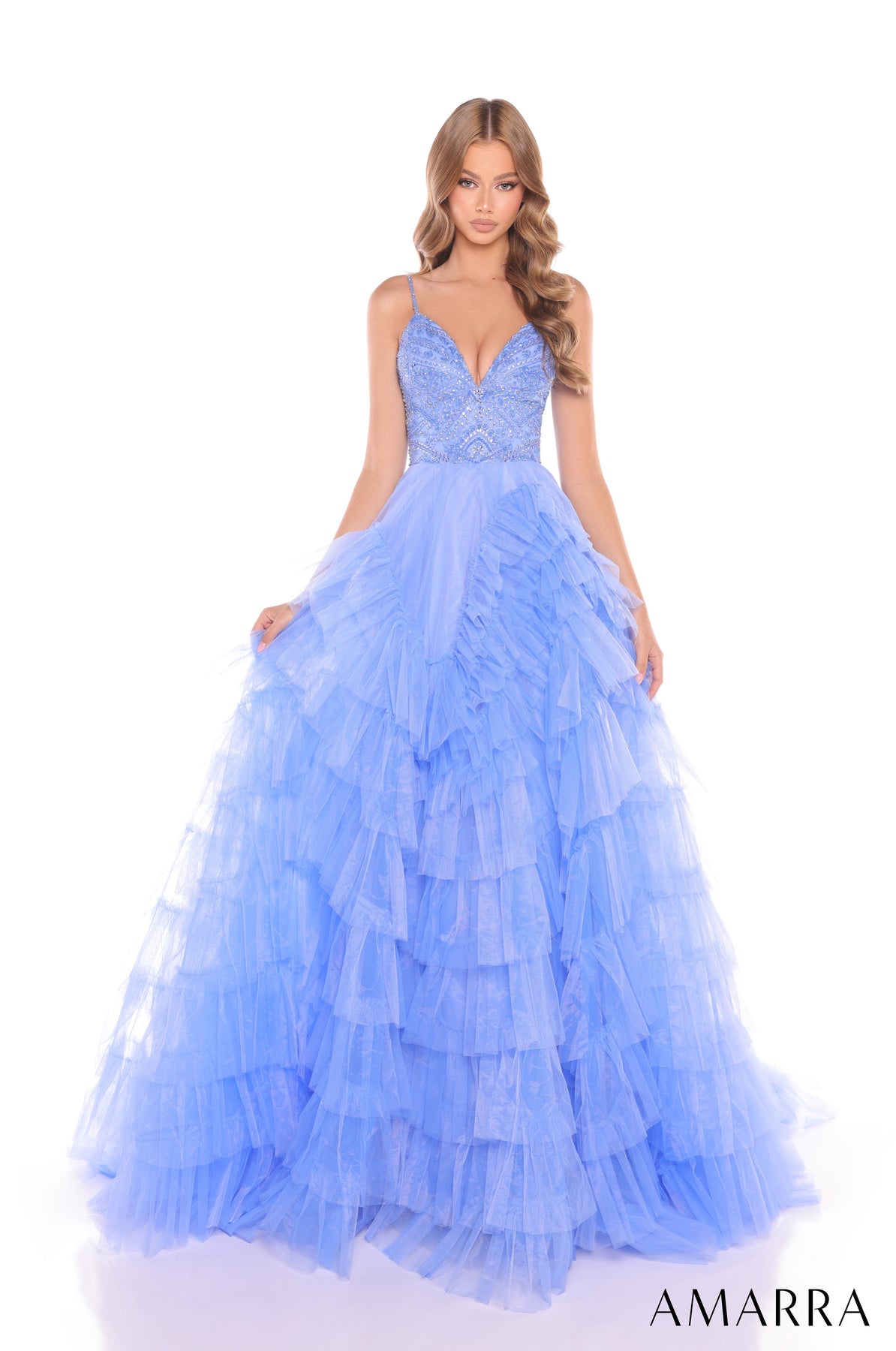 Step into the spotlight with the Amarra 88296 Dress, where playful ruffles meet sparkling beadwork. This sleeveless ball gown features a daring V-neckline and delicate spaghetti straps that highlight your elegance. The beaded bodice adds a touch of glamour, while the tiered tulle skirt cascades in voluminous layers for a dramatic effect. Finished with convenient pockets and a sleek zipper back, this floor-length beauty is perfect for turning heads at proms, galas, or any black-tie affair.