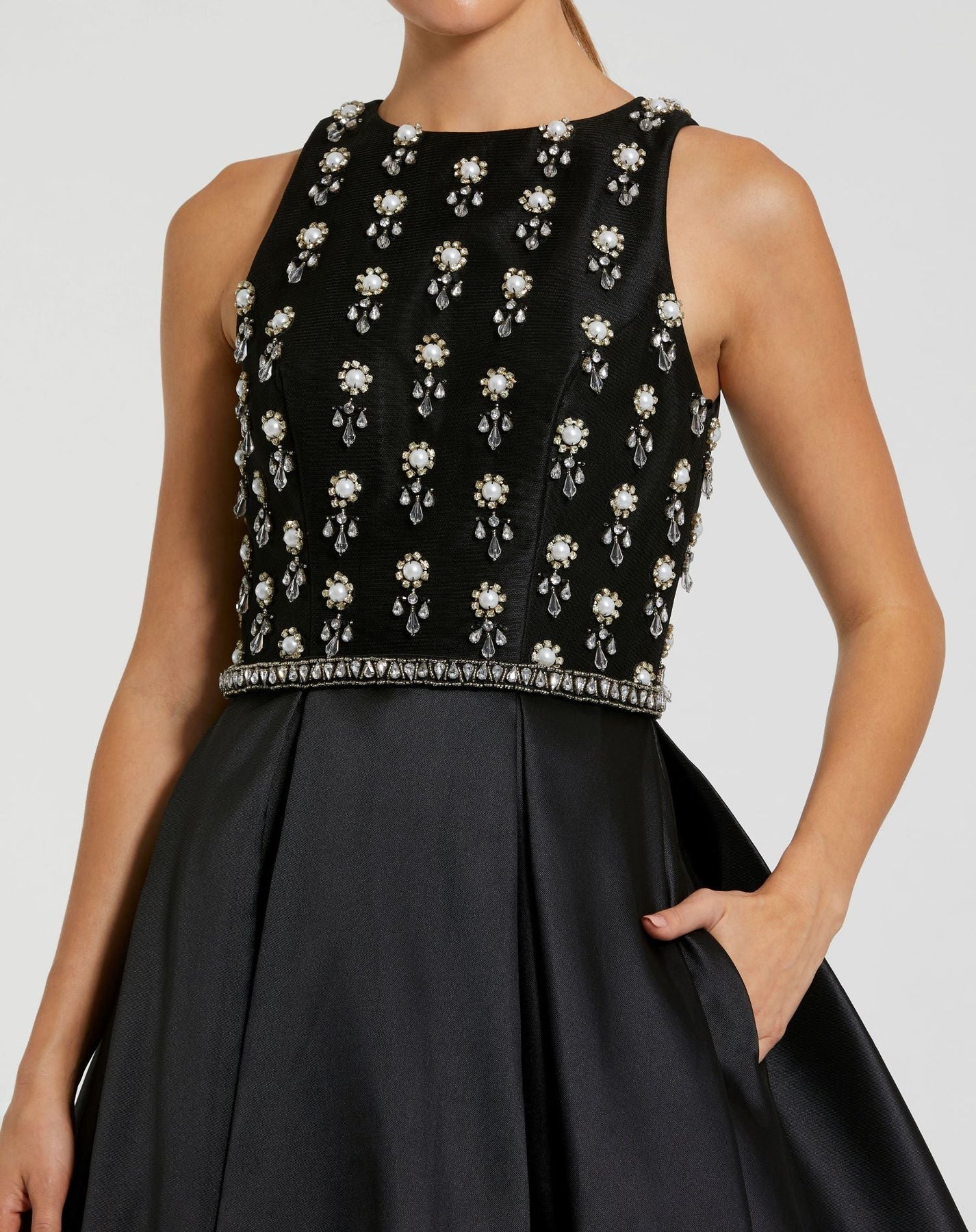 This timeless elegant ballgown features a stunning beaded bodice, a rhinestone trimmed waist, and pockets, making it the perfect gown for any evening event.