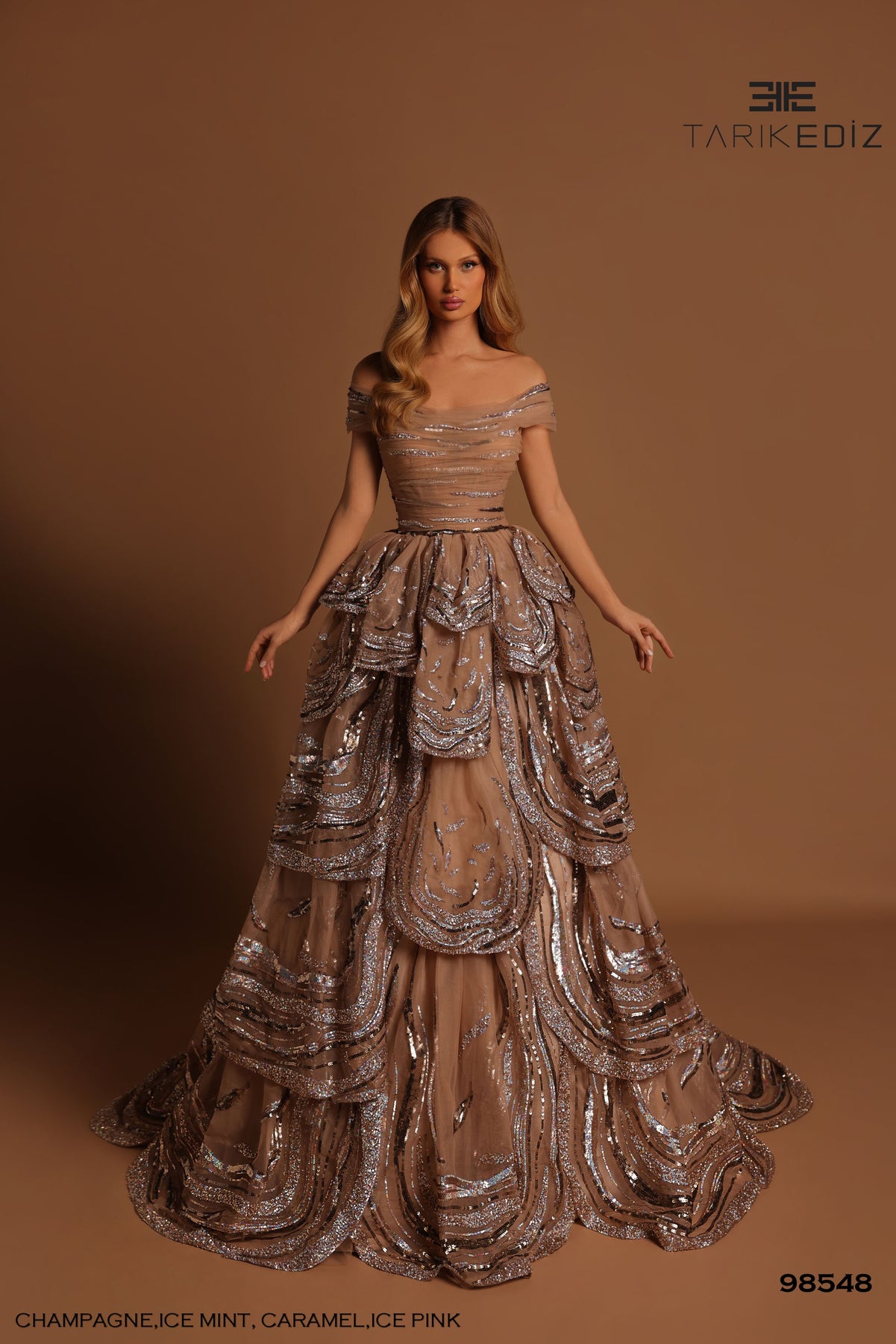 This exquisite TARIK EDIZ 98548 dress features an off-the-shoulder design with a dramatic long tail and intricate beading. Perfect for prom or an evening event, this tiered ruffle dress exudes elegance and grace. Make a statement in this stunning long dress.