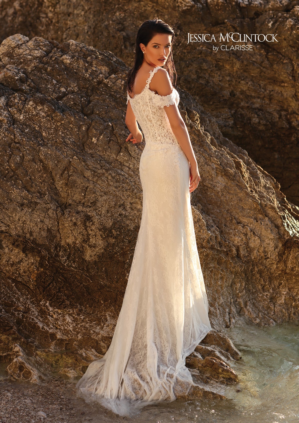 This sexy and romantic sheath bridal gown has pretty scallop edge details on the sweetheart neckline, lace corset bodice, off-shoulder straps, and a sheer lace back.