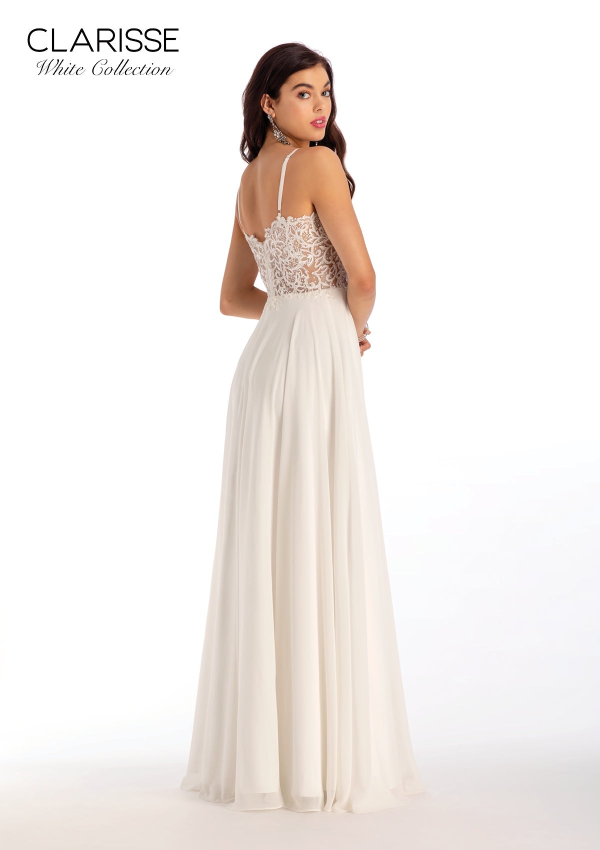 A-line gown with sheer embroidered sweetheart bodice and flowing chiffon skirt.