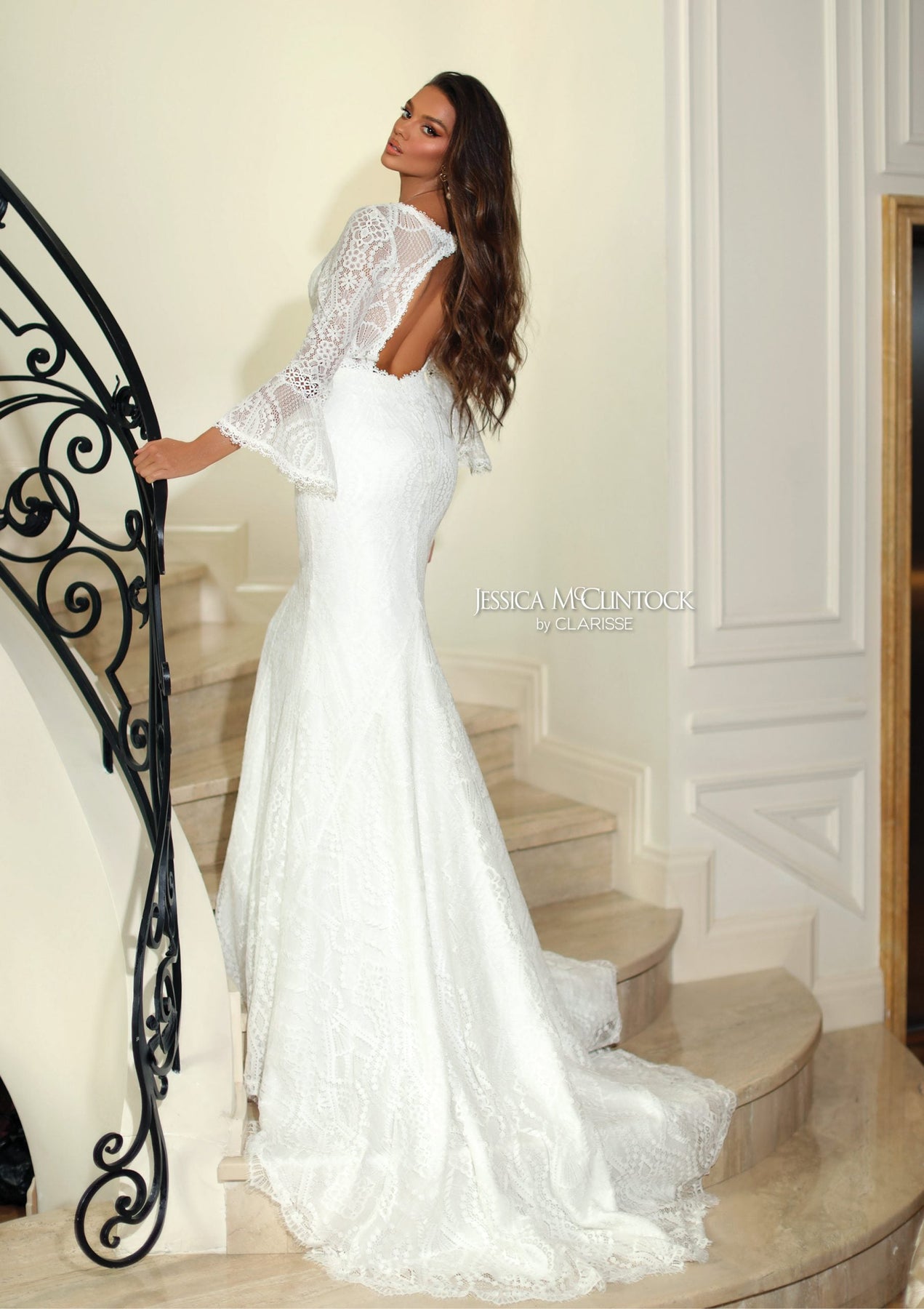 A stunningly beautiful Fit and Flare Lace Wedding Dress, with a V-neckline adorned with sheer lace bell sleeves, an intriguing open keyhole back, and a spectacularly sweeping train.