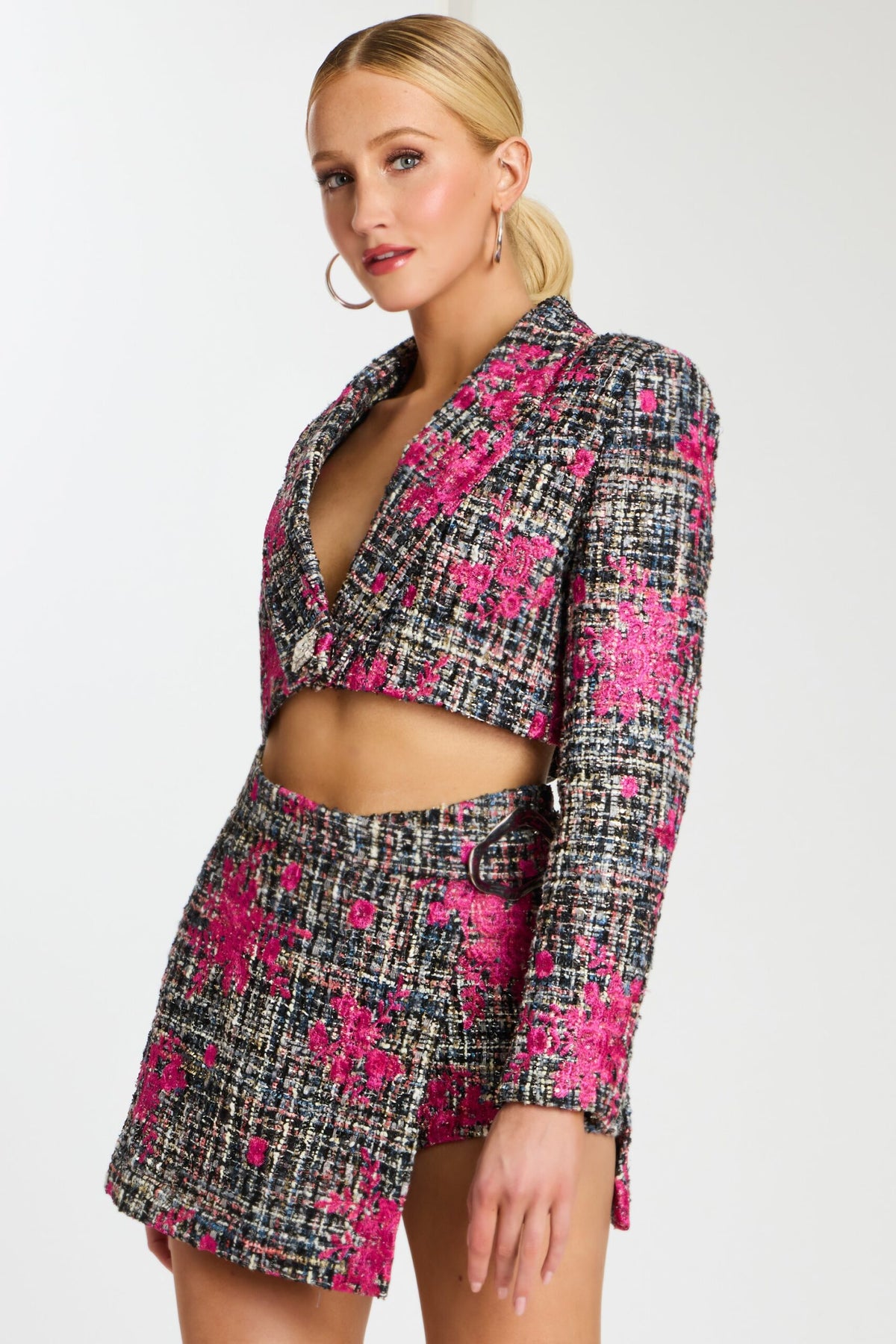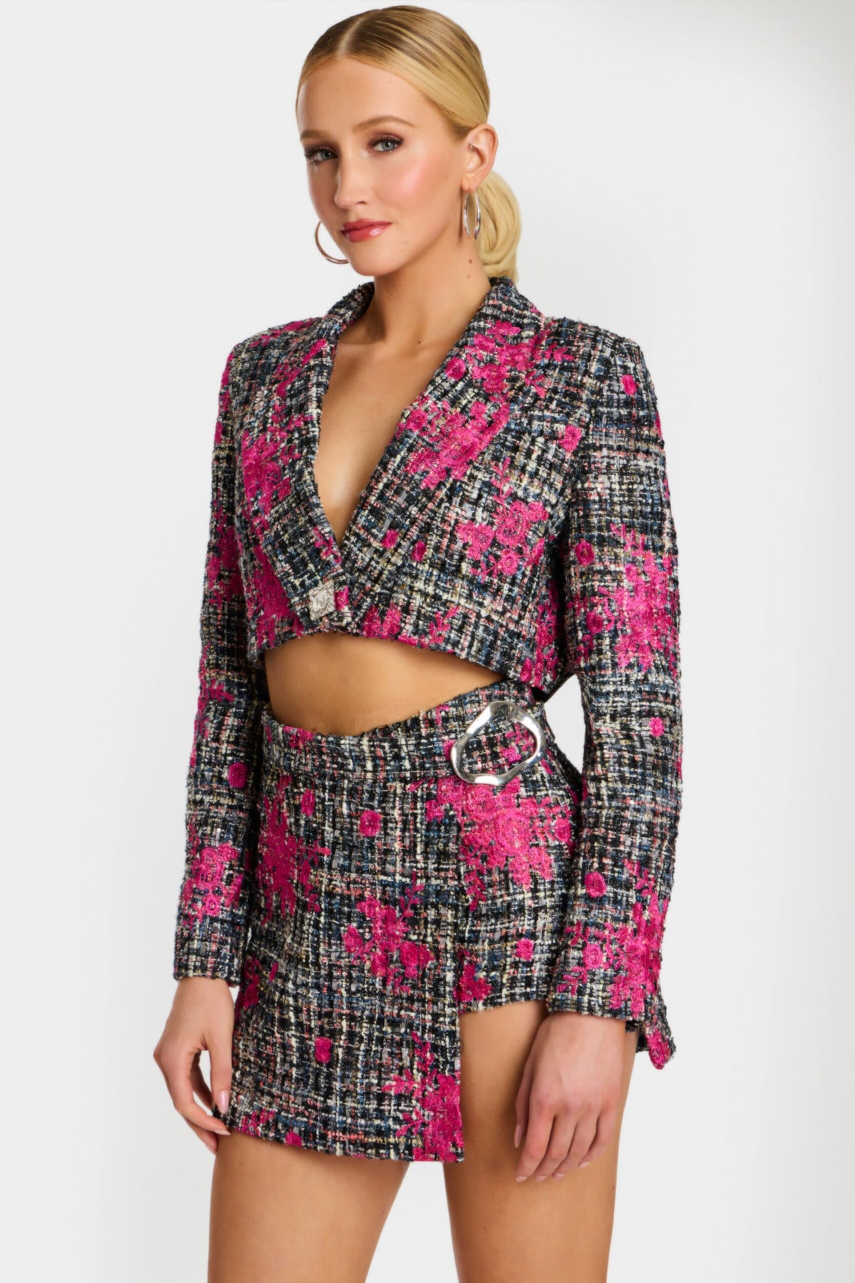 Elevate your wardrobe with the Jovani 46305, a sophisticated cropped blazer and skirt set featuring an intricate tweed floral design. This ensemble combines classic tailoring with modern elegance, offering a refined silhouette perfect for formal occasions or stylish office wear. The textured tweed fabric adds depth and dimension, while the floral pattern brings a subtle feminine touch. Designed for a polished look, this set ensures both comfort and confidence throughout your day.