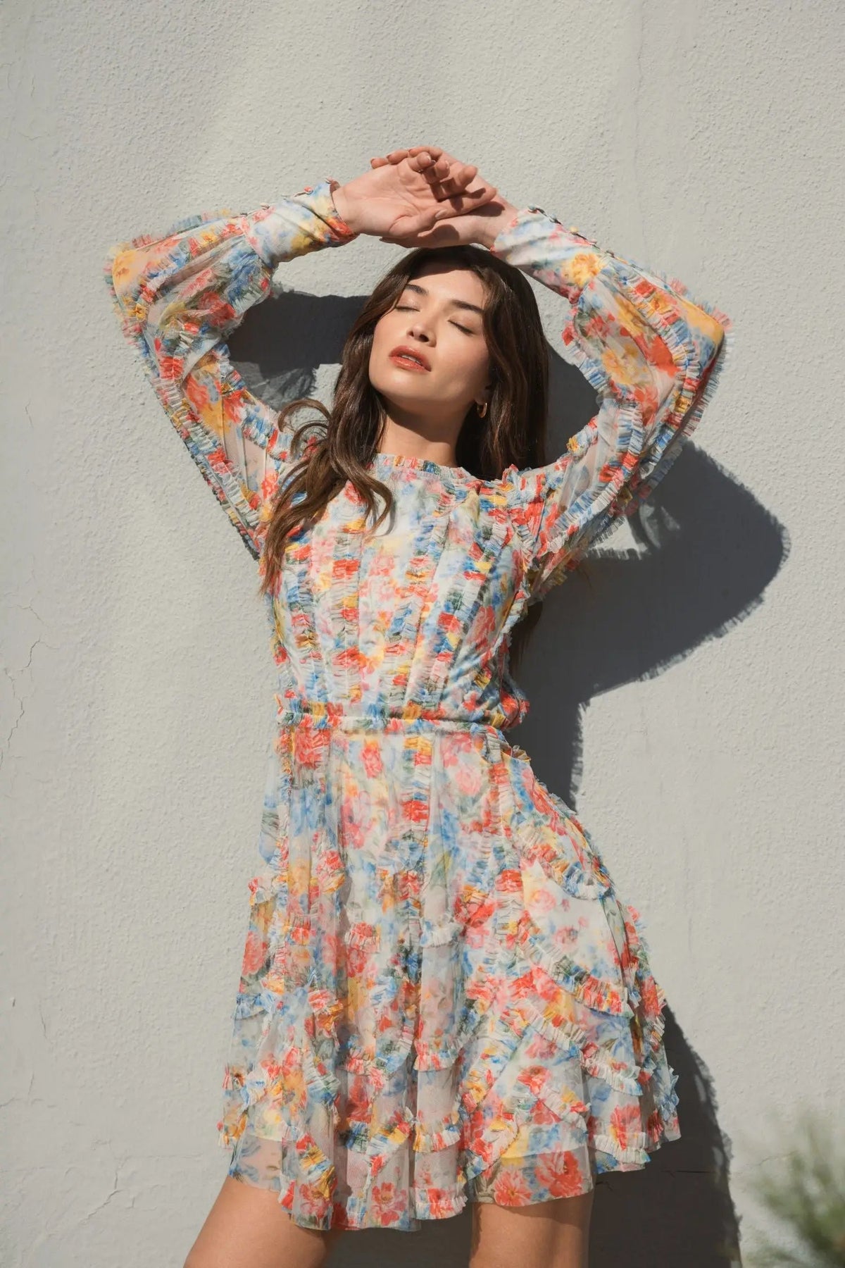 Turn heads in this vibrant floral mini dress with long, romantic puff sleeves, baby ruffles, and a lace-up back—blending elegance and playfulness for luncheons, soirées, and daytime events.
