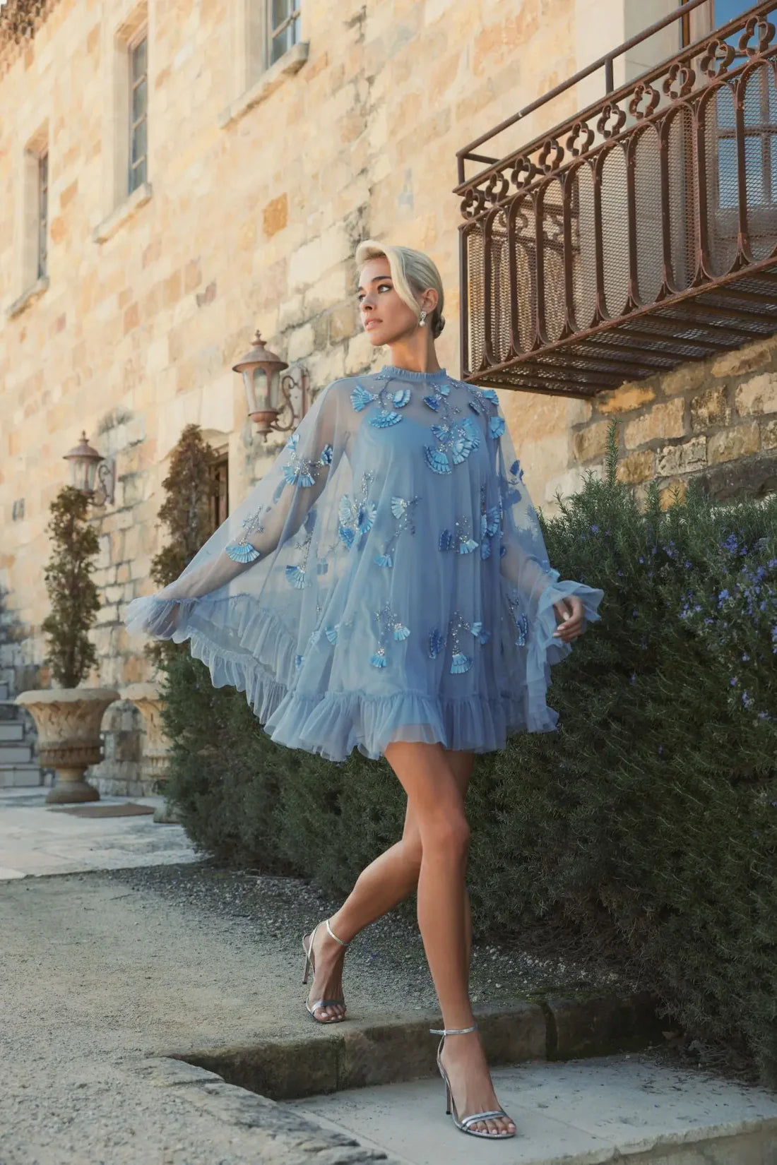 This  A-line mini dress features a mesh overlay hand-embellished with beading and sequin details. Crafted from mesh overlay, the dress is fully lined in the bodice and skirt, with sheer unlined sleeves for added flair. Its high neckline and cape sleeves combine to create a modern silhouette.