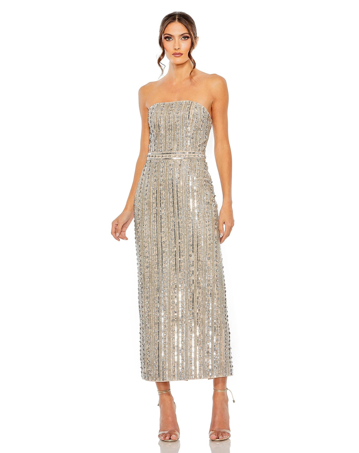 Dazzle at any event with our Embellished Strapless Column Dress. This stunning dress features a strapless design adorned with intricate embellishments that catch the light beautifully. The column silhouette creates a sleek and sophisticated look, perfect for evening occasions.