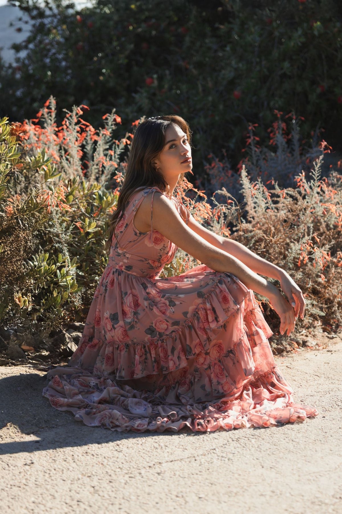 Embrace effortless beauty in this chiffon floral dress. Featuring a flattering V-neckline and sleeveless design, it’s enhanced with unique drawstring shoulder detailing for a chic touch. The tiered ruffle skirt adds playful movement, while the V-back creates a subtle yet elegant finish. Perfect for any occasion, this dress radiates femininity and charm.