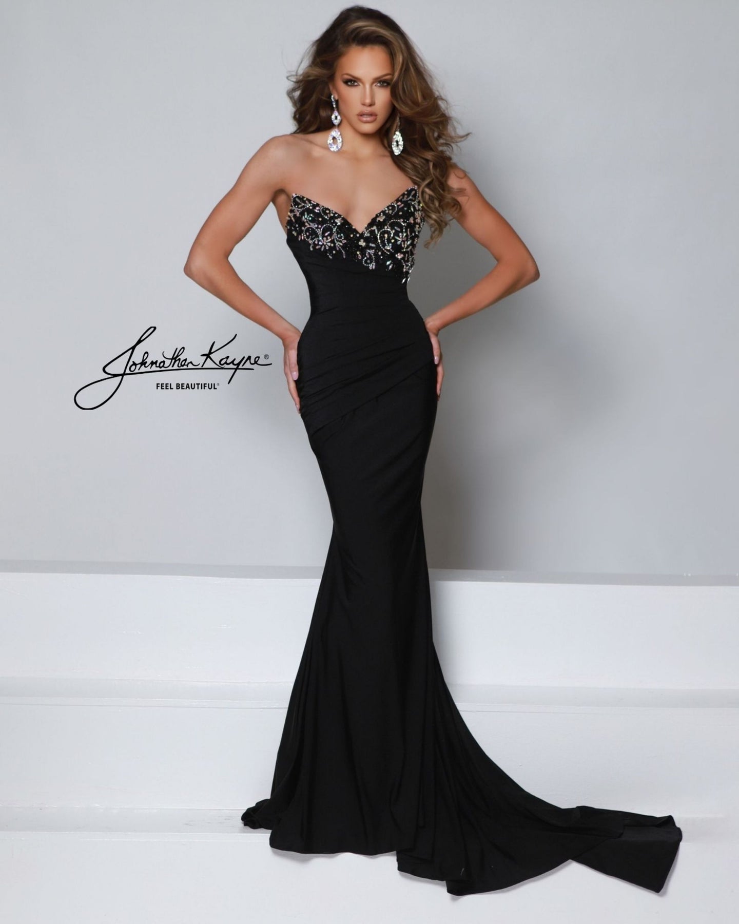 Get ready to steal the spotlight in the Johnathan Kayne 2941 Dress! This strapless beauty features a sparkling beaded top and a pleated bodice that flatters every curve. The pointed sweetheart neckline adds a flirty, romantic vibe—perfect for turning heads at your next event. Dance, twirl, and shine all night long in this unforgettable gown!
