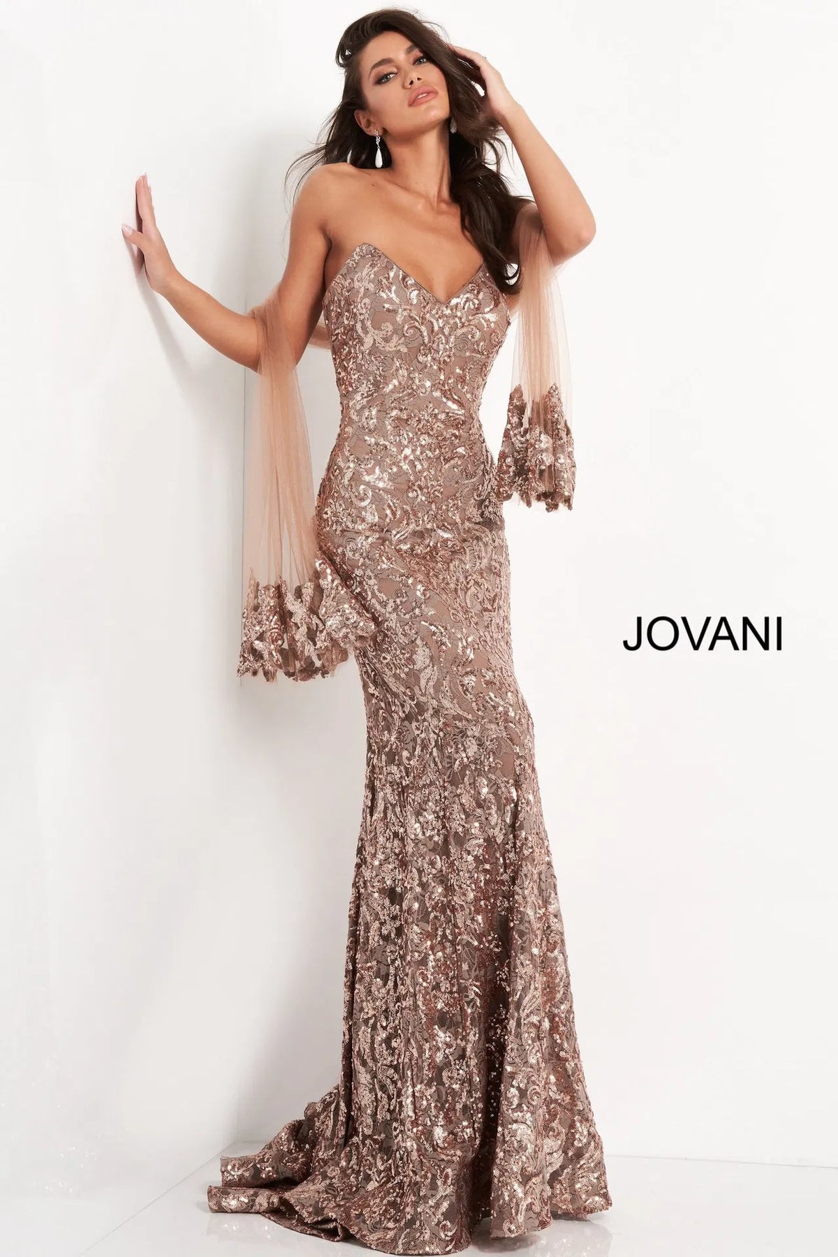 Dazzle in the Jovani 05054 Dress, where intricate copper sequin embellishments create a mesmerizing shimmer with every movement. Expertly designed to flatter your figure, this evening gown radiates confidence and glamour from every angle. Perfect for those special moments when you want to feel absolutely stunning, this dress transforms you into the most captivating person in the room.