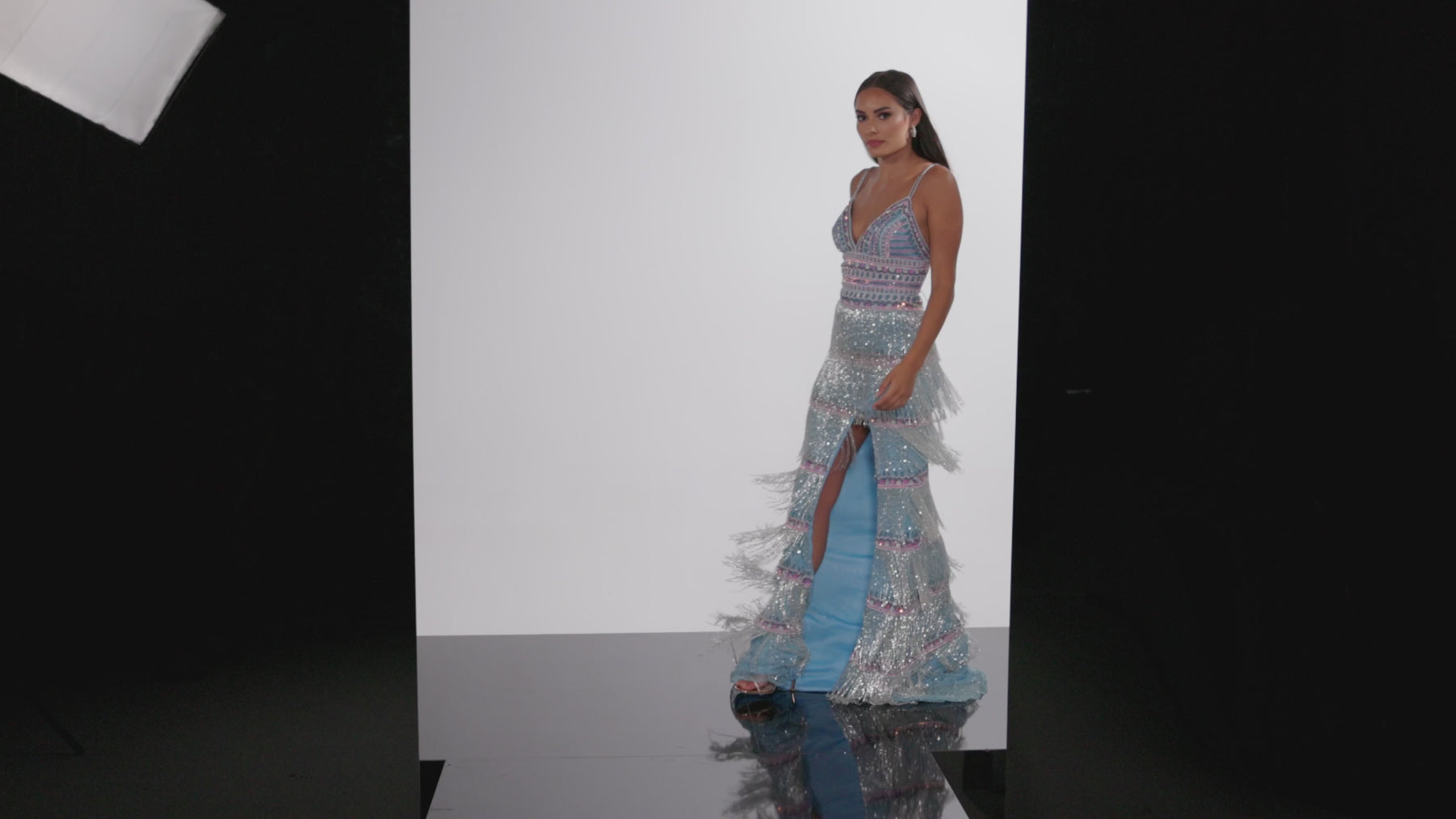 Step into the height of modern luxury with Jovani 38846. This chic, sleeveless sheath gown features a dazzling beaded V-neckline and a strappy back for a touch of sophistication. The tiered fringe skirt, high slit, and sweeping train create a striking and dramatic look that will surely turn heads. Make a bold statement in this Jovani 38846 creation! Model is wearing Light Blue.