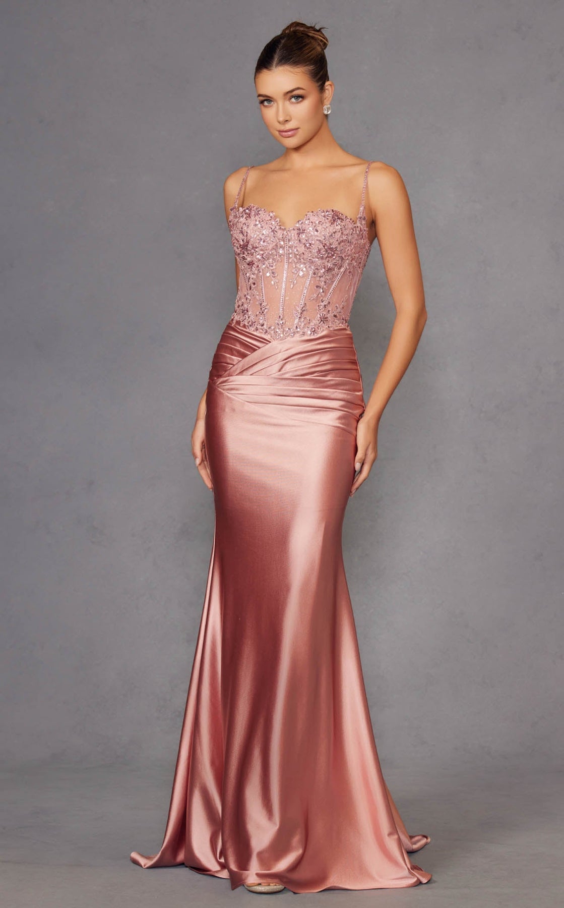 Step into the spotlight in the Juliet JT2531K, where elegance meets pure drama. This show-stopping mermaid gown features a sweetheart neckline and delicate spaghetti straps that frame your shoulders beautifully. The structured bustier bodice dazzles with intricate floral beaded appliqué, while ruched satin cinches the waist before the skirt hugs your curves in all the right ways. A sweeping floor-length hem completes this glamorous statement piece—perfect for turning heads at any special occasion.