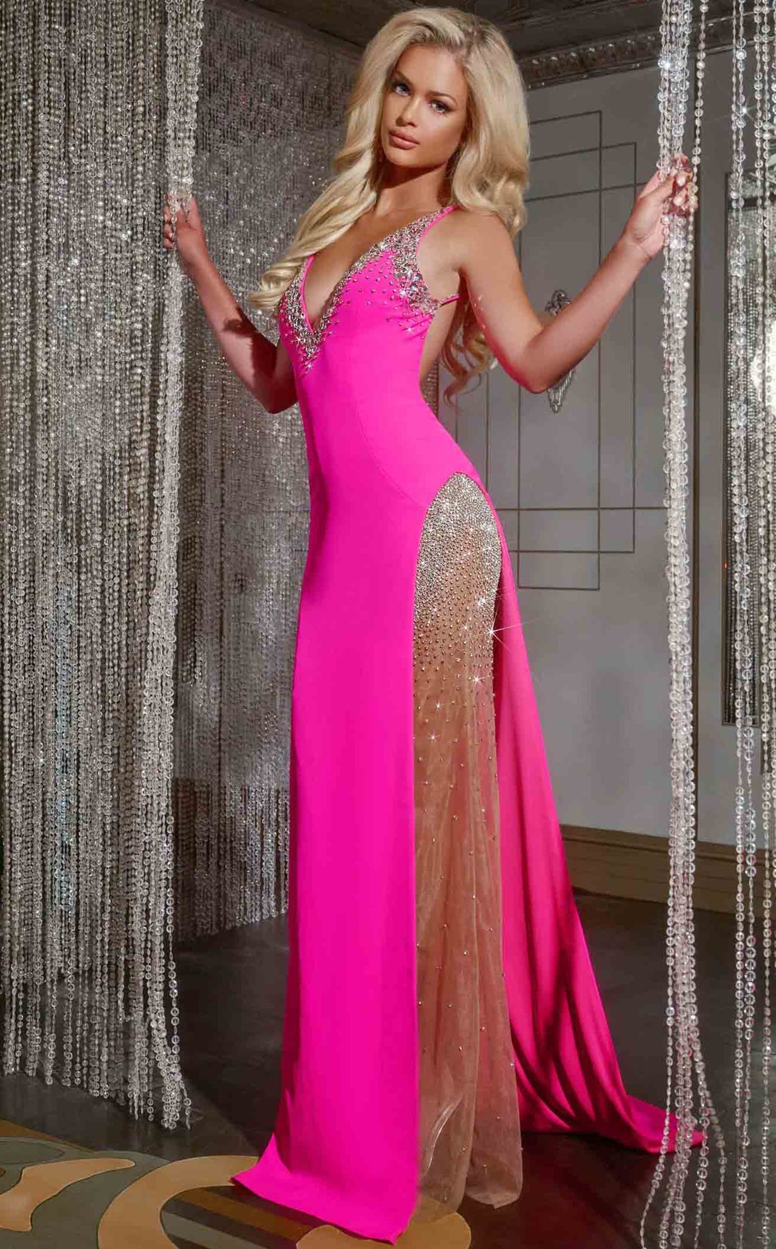 Experience elegance and allure in the Jovani 38983 Dress. Its mermaid silhouette flatters your figure, while the floor-length design and high slit add drama. Intricate beading sparkles in the light, while the V-neckline, sleeveless design, and open back exude modern allure. Make a statement in this sophisticated masterpiece.