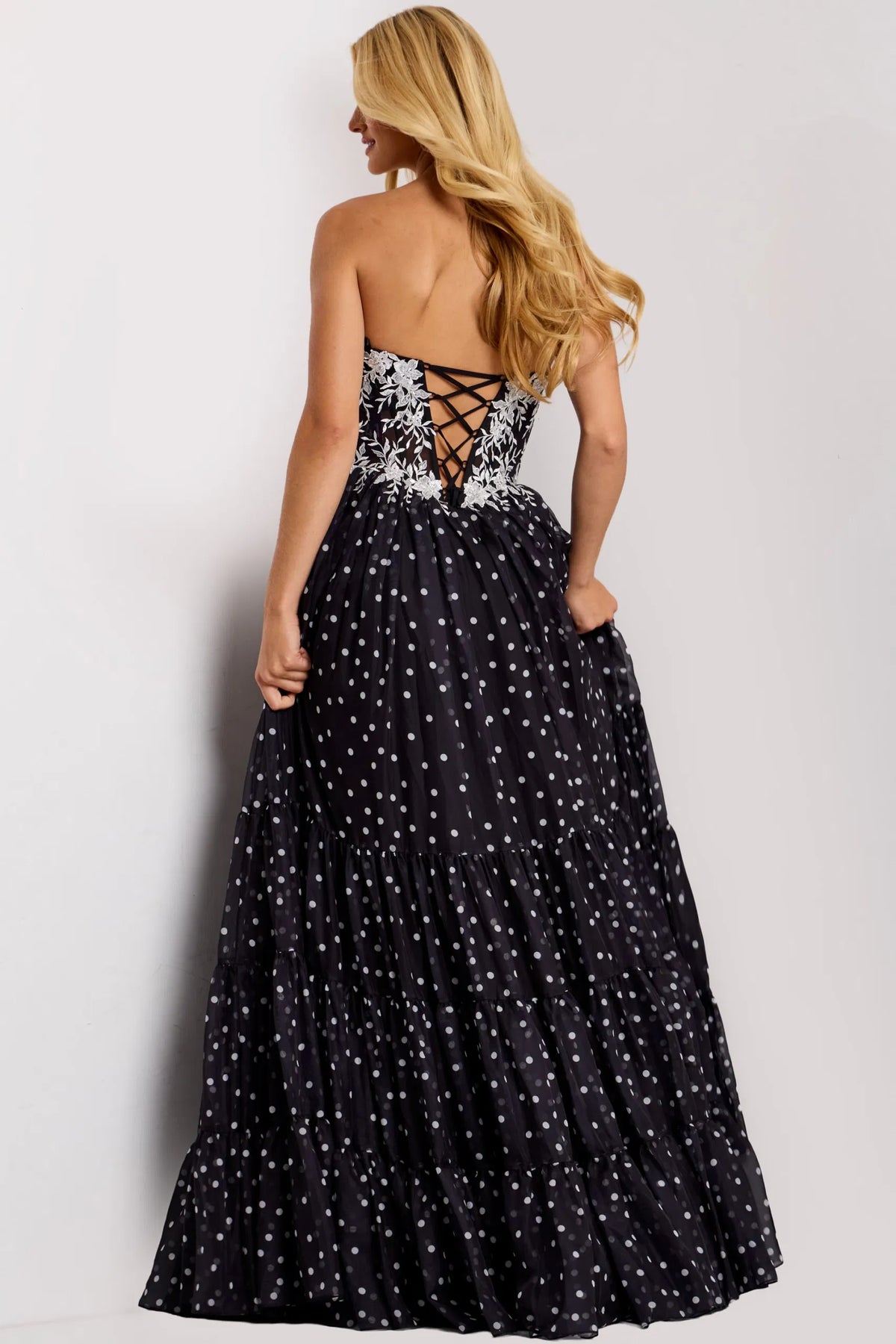This strapless gown features a delicate floral lace bodice that beautifully complements the playful polka dot skirt. Designed for comfort and style, it offers a flattering fit that enhances your silhouette while adding a touch of elegance and fun. Perfect for special occasions where you want to feel confident and graceful.