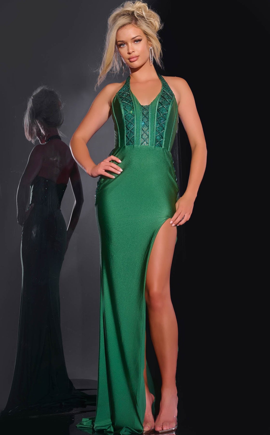 Elevate your style with the Jovani D5034 Dress. A modern twist on a classic design, this gown features a sleek halter neckline, corset-style bodice, and geometric detailing. The stretch jersey fabric hugs your curves while the side slit adds a seductive touch. With its low-back feature, this floor-length dress exudes sophistication. Perfect for any formal event, you'll stand out with elegance and poise in this contemporary and timeless gown.