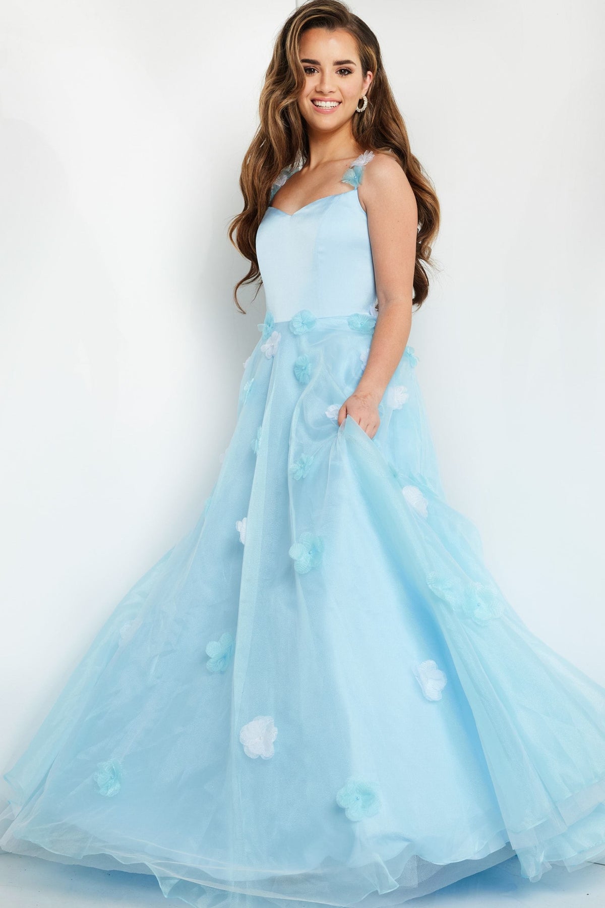 Step into pure magic with the Jovani K25988, a floor-length ballgown that's straight out of a fairy tale. This enchanting dress features a romantic sweetheart neckline and sleeveless silhouette, adorned with delicate floral rosettes that dance across the skirt. Crafted from sumptuous layers of tulle, it creates an ethereal, cloud-like effect that twirls beautifully with every movement. Perfect for proms, galas, or any occasion where you want to feel absolutely spellbinding.