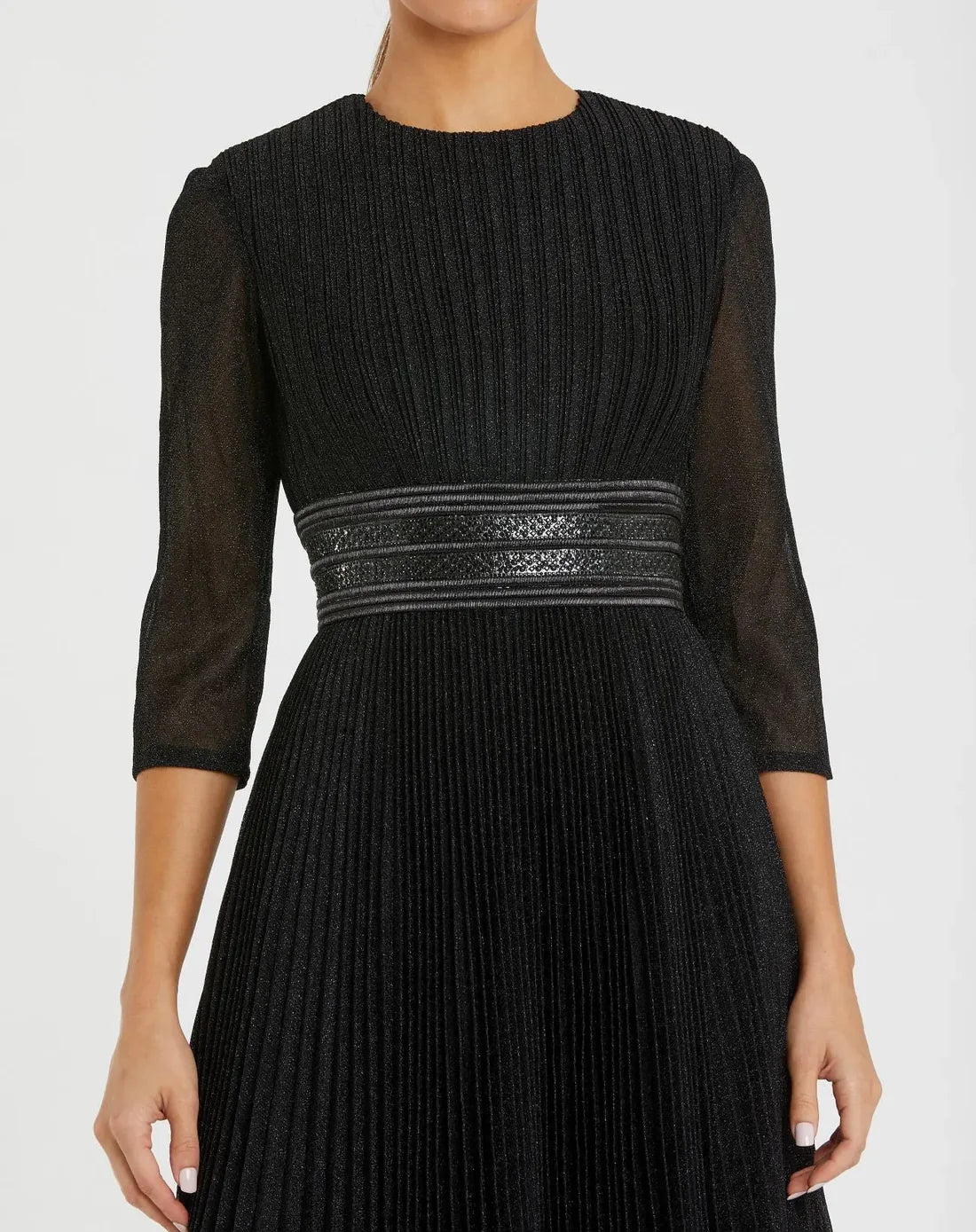 Elegant 3/4 sleeve dress with an A-line pleated tea-length skirt, round neckline, and a dramatic embellished waistband.