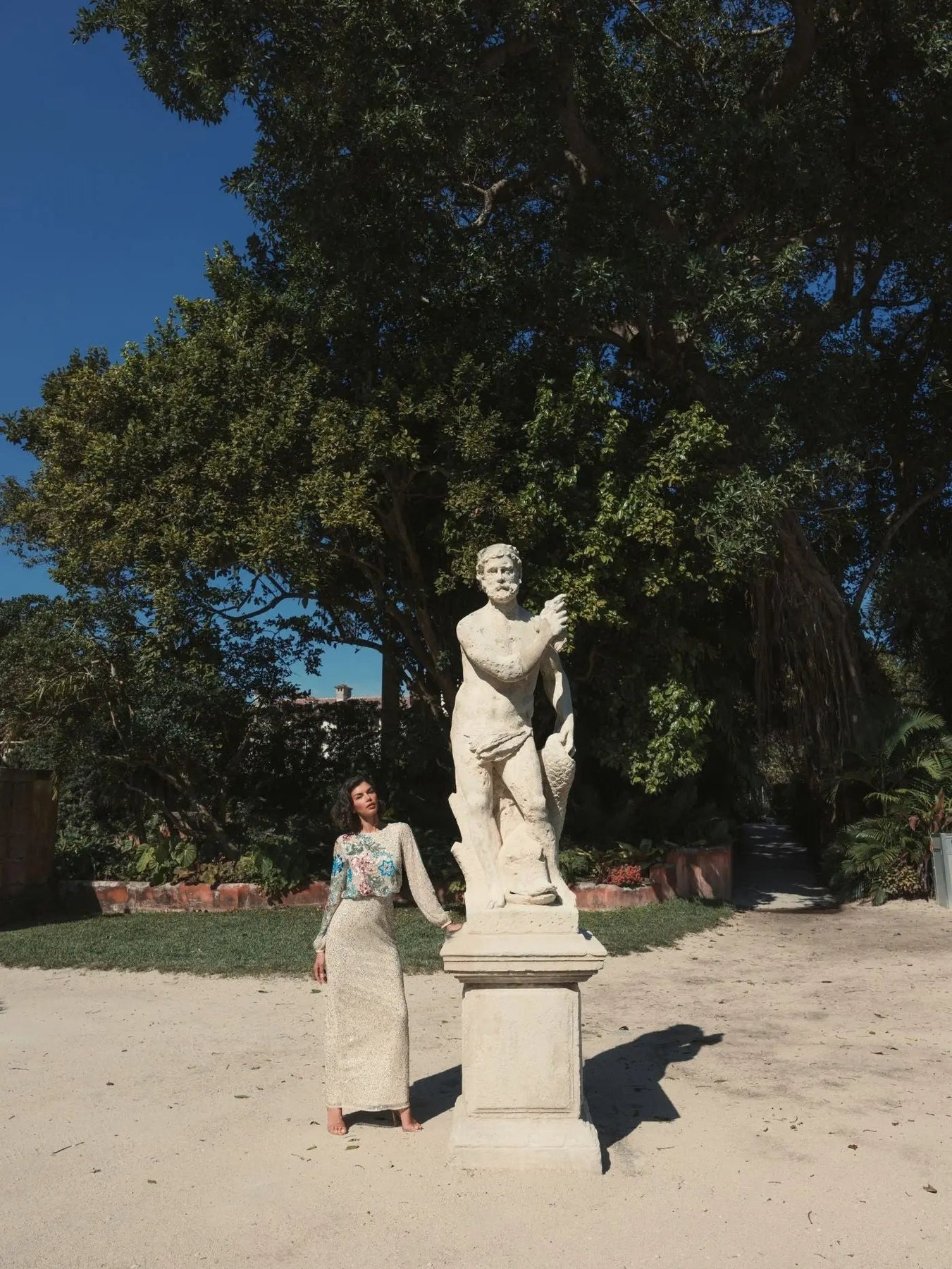 A timeless design, this gown dazzles with intricate floral sequin embellishments and delicate beading. Featuring a back vent slit and semi-sheer long blouson sleeves, it's the perfect choice for elegant evening and formal events.