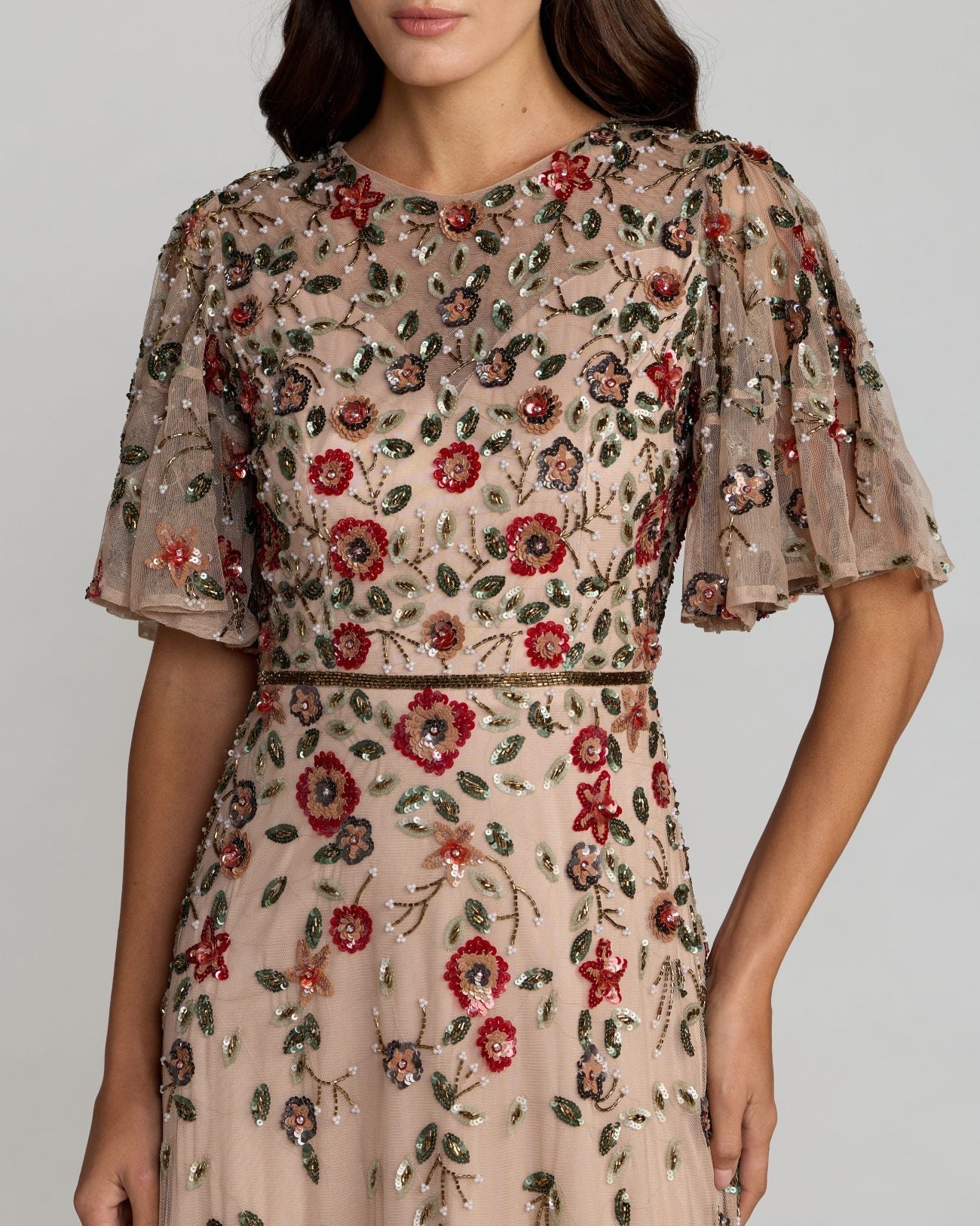 Embrace vintage-inspired glamour in this stunning hand-embellished midi dress. Sheer flutter sleeves, glimmering floral embellishments, and a soft ruffle hem make it the perfect dress for cocktail parties, weddings, or any event that calls for effortless elegance.