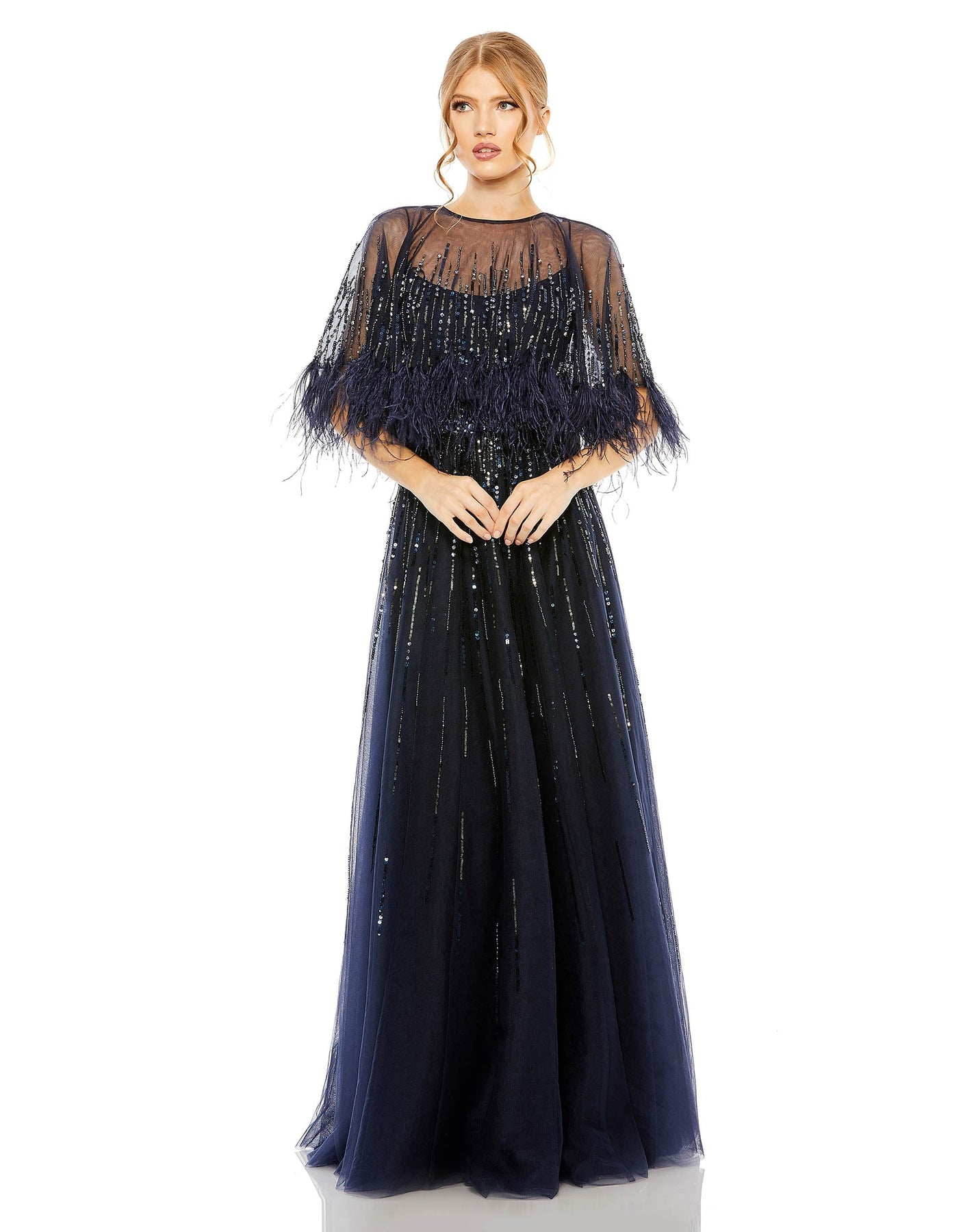 Embellished A Line Dress with Feather Detail Cape