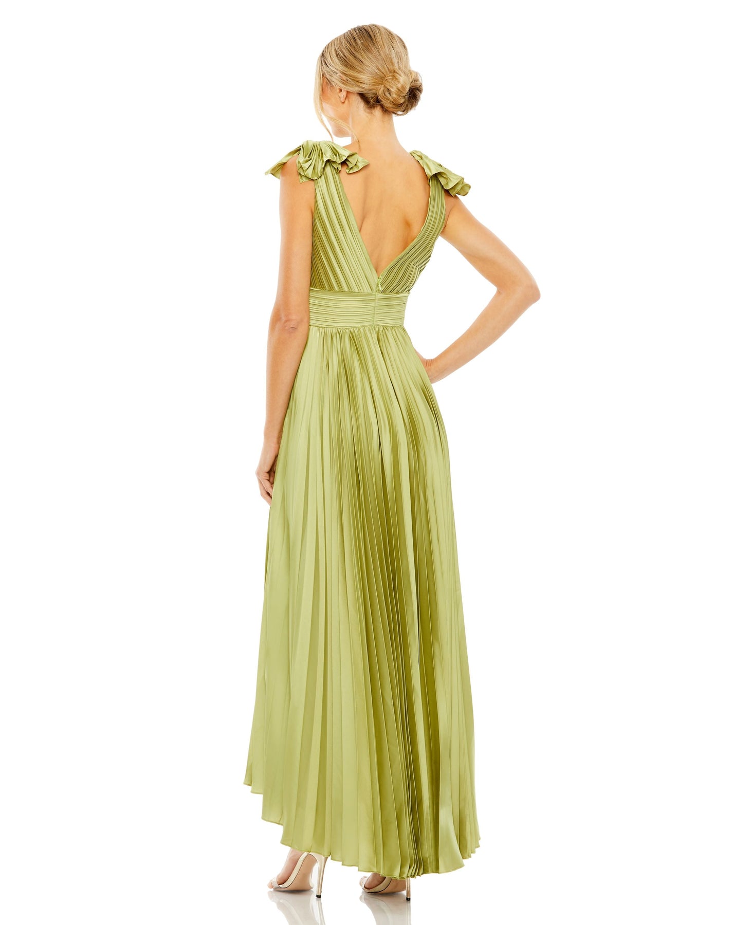 This elegant high-low gown features pleated jersey fabric for a figure-flattering drape. The deep plunge neckline and ruffled strap detail add a touch of glamour to the sleek sleeveless design, making it the perfect choice for any formal occasion.