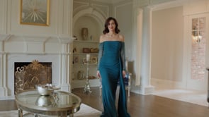 This daring stretch crepe gown flaunts an off-the-shoulder neckline paired with sheer, beaded long sleeves that add a touch of bold elegance. Its softly draped silhouette contours the body, creating a striking and confident look for any occasion.