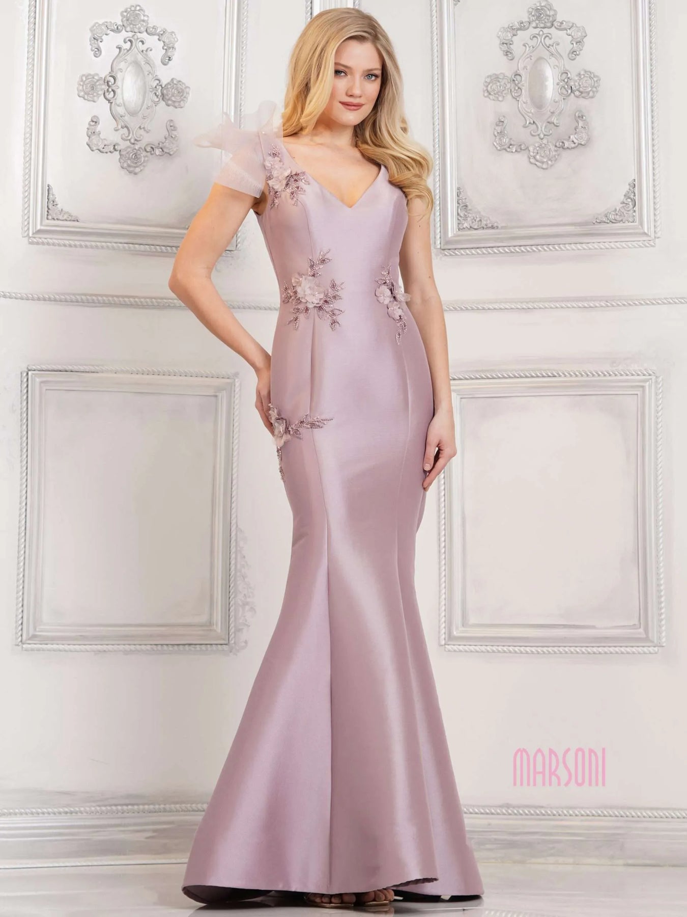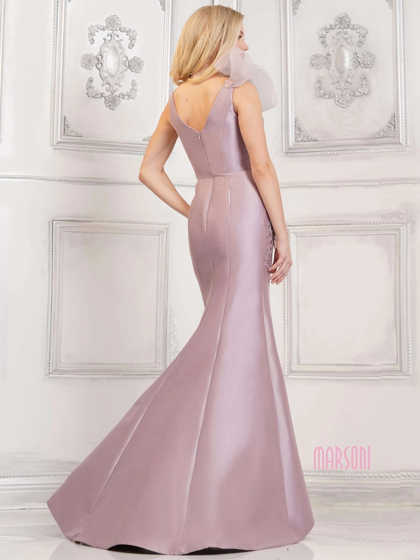 Shimmer and shine in our MARSONI BY COLORS MV1309 Dress. The stretch mikado fit & flare gown is adorned with beaded 3D floral applique and a playful horsehair corsage on the shoulder. Perfect for making a statement at any special occasion.