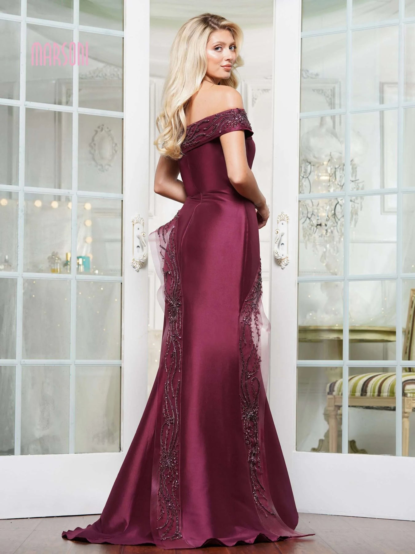 Dazzle in this off-the-shoulder fit and flare gown from MARSONI BY COLORS. The cascading drape embellished with crystal beading adds just the right touch of glitz and glam. Perfect for any formal occasion, this dress will have you standing out in the crowd. (No need for a disco ball with this number!)