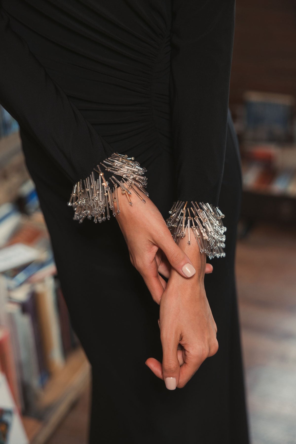 This long sleeve gown is made from jersey fabric, providing a comfortable and stretchy fit. The boat neckline and ruched waist detailing add timeless elegance, while the beaded cuff long sleeves adds a touch of glamour. Perfect for any occasion, this gown offers both style and comfort.