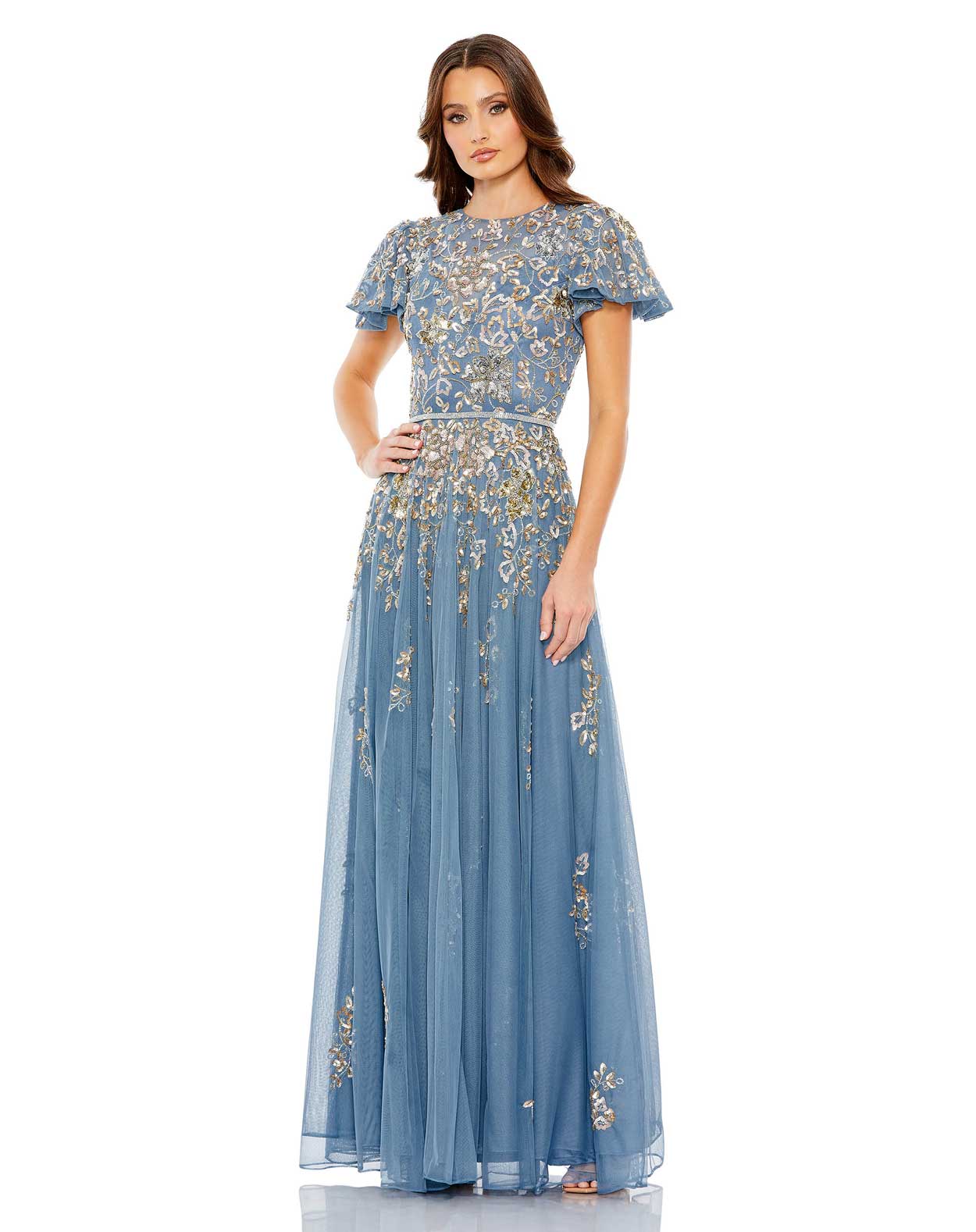 Introducing our Embellished Butterfly Sleeve High Neck Gown a sophisticated option for your special occasions. This gown boasts an illusion neckline and elegant short butterfly sleeves. What makes it truly exquisite is the intricate floral pattern, meticulously crafted with hand-stitched sequins and beads.