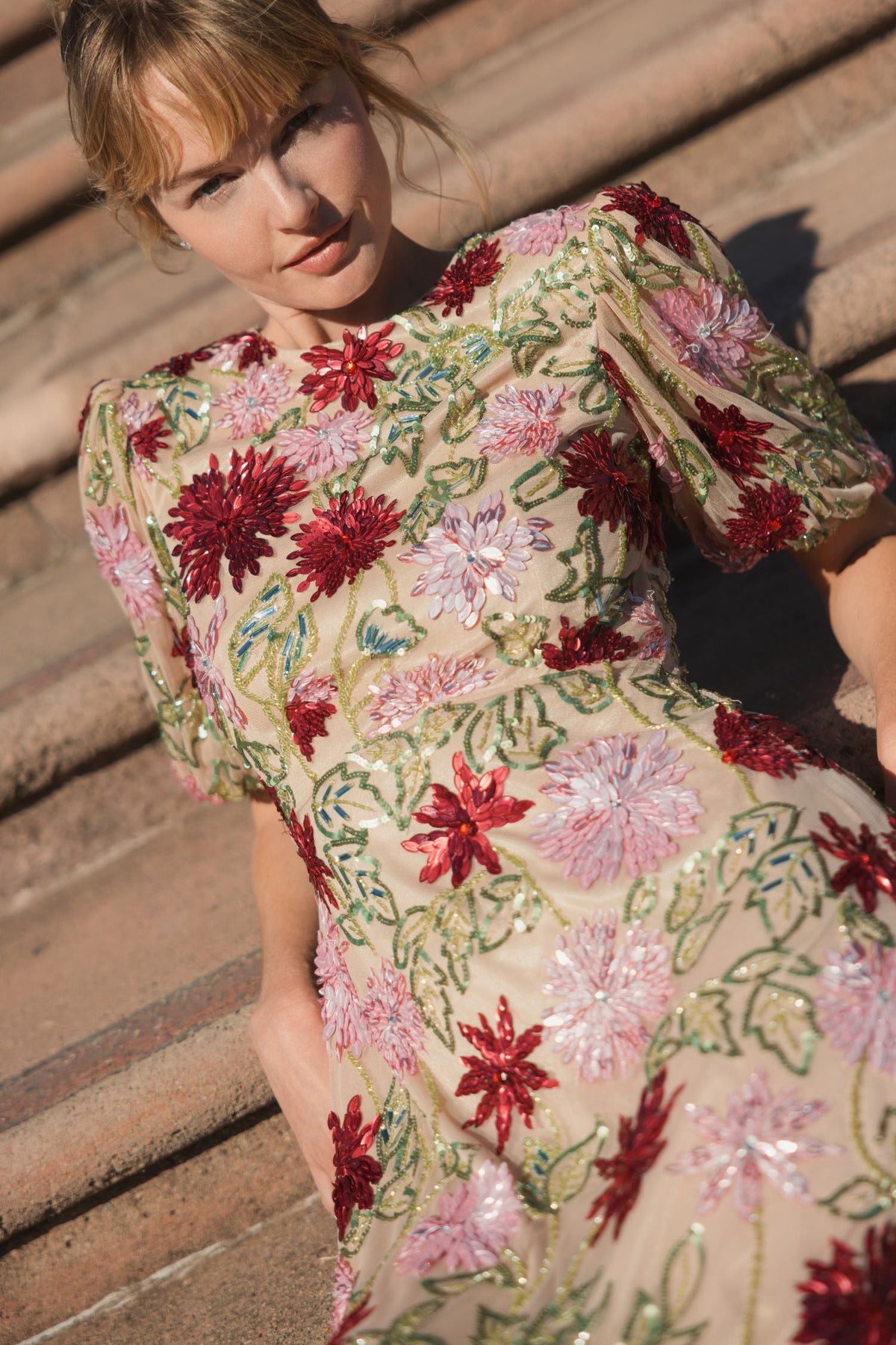 Beige Floral Beaded Mesh Puff Sleeve Gown