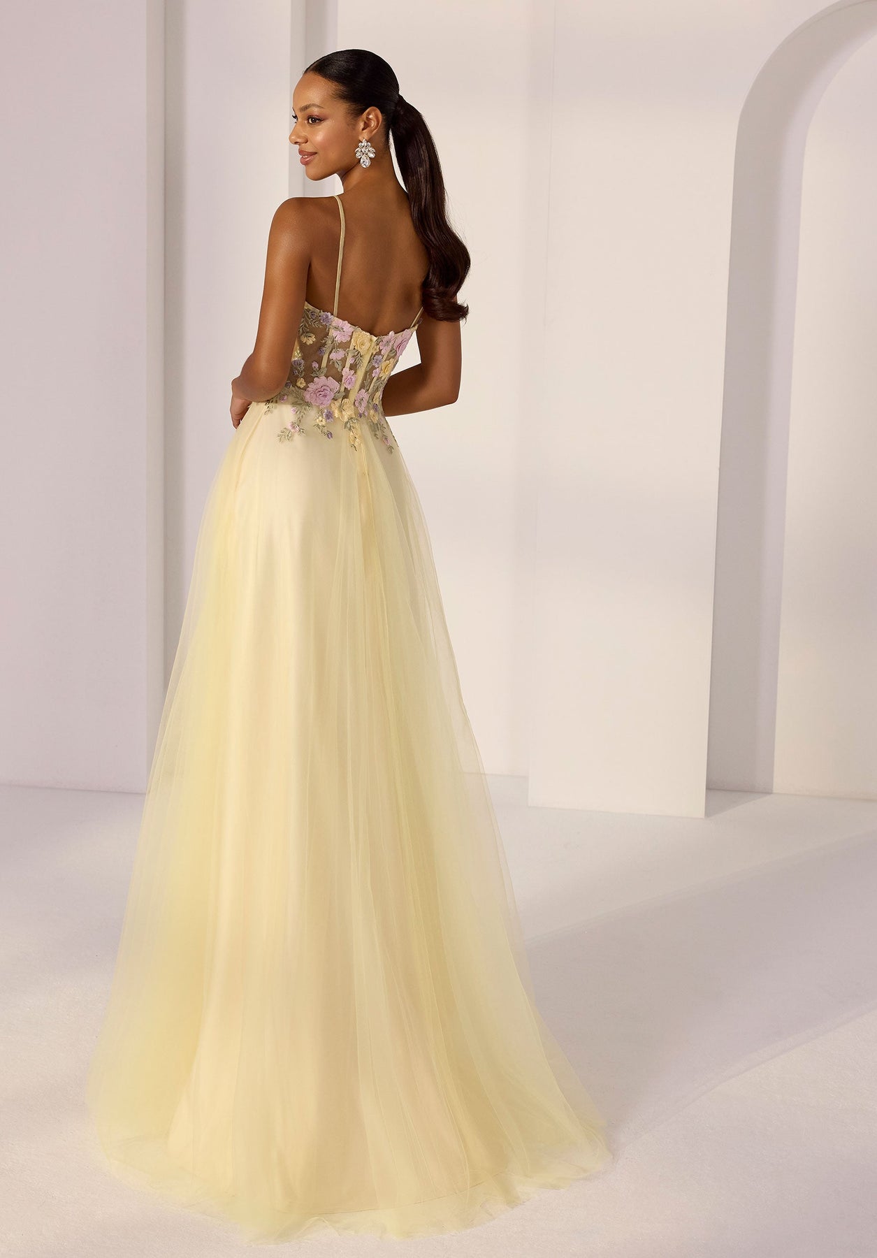 Romantic meets modern in this dreamy tulle A-line party dress. The sheer sweetheart bodice with corset boning sculpts the waist, while colorful threadwork floral embroidery adds playful, eye-catching detail. Light, flowing tulle completes the silhouette, creating a look that’s whimsical, feminine, and effortlessly party-ready.
