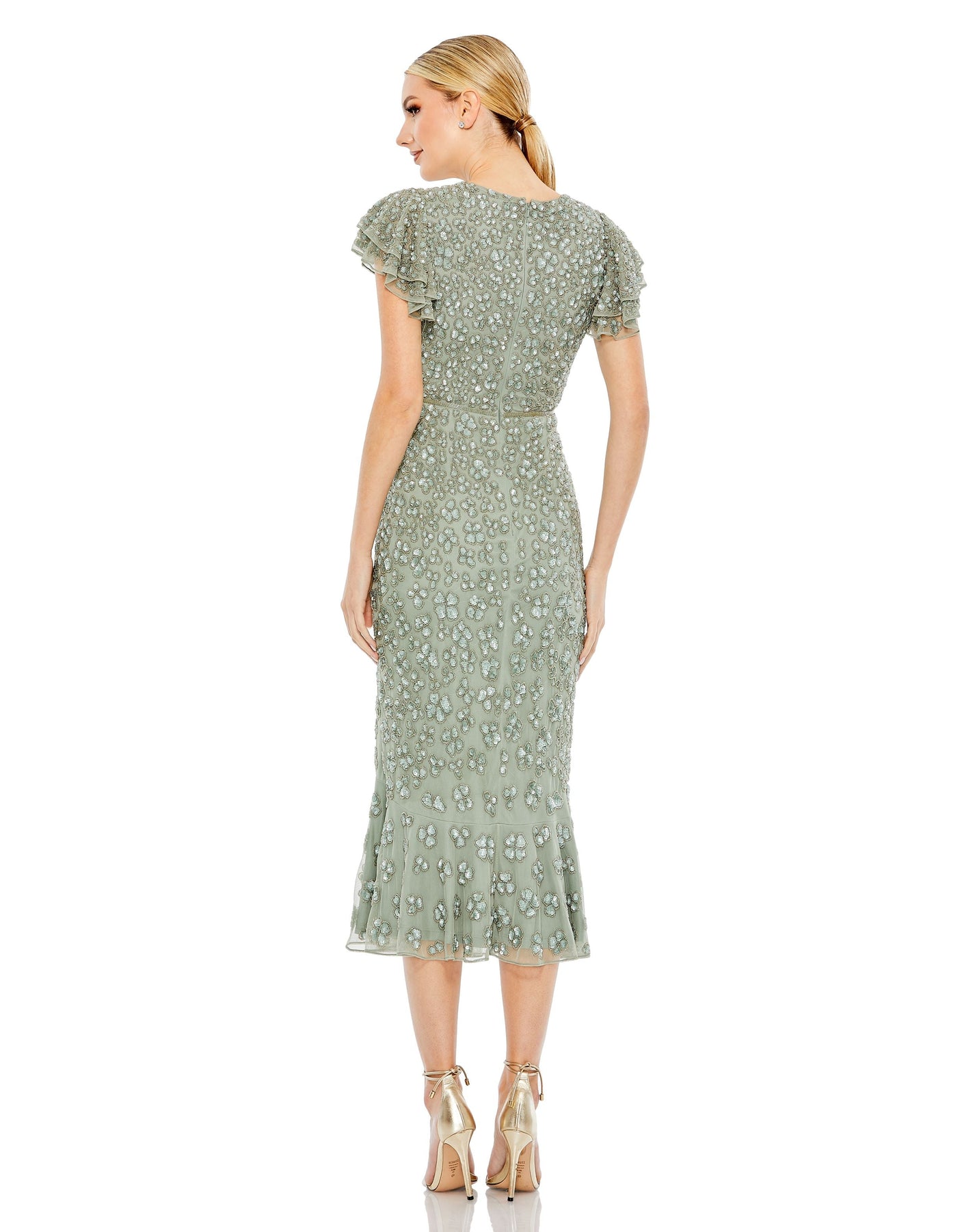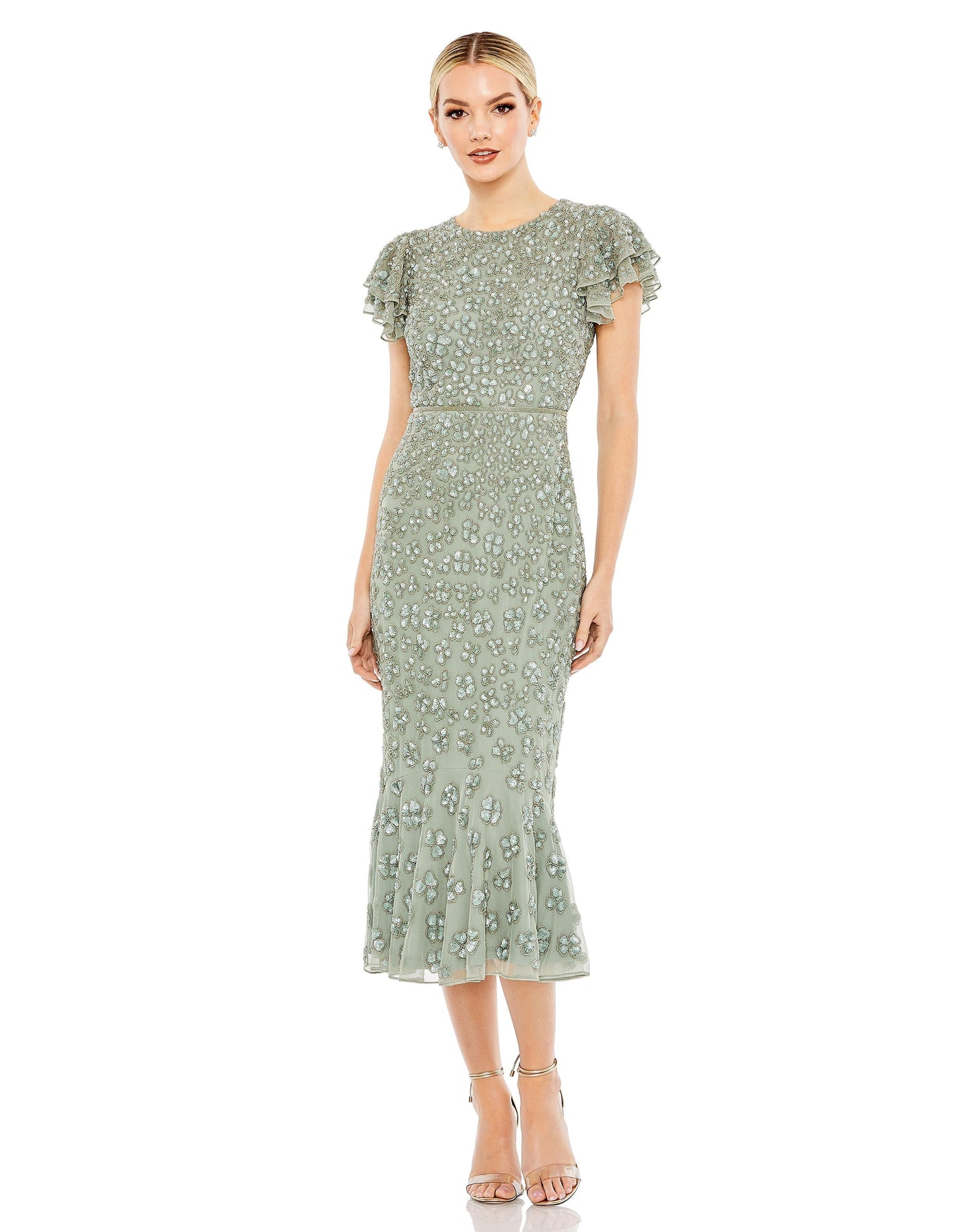 Elevate your style game with the Mac Duggal 10771 Dress. This midi dress features intricate hand beading and elegant flounce sleeves for a touch of sophistication. Its timeless appeal makes it perfect for any formal event. Available in an assortment of colors to suit any occasion.