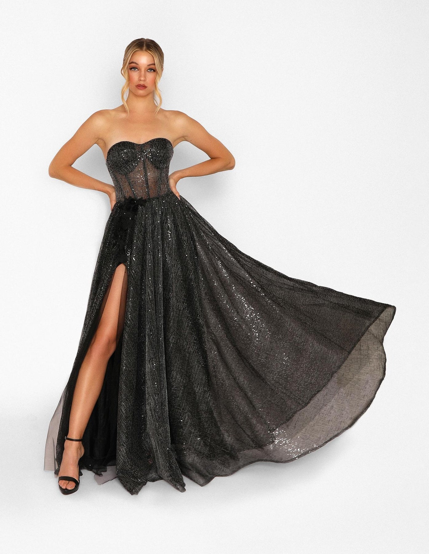 Step out in style in our 7146 Dress. This elegant gown is crafted with a corset bodice, delicate lace, and dazzling sequins. Perfect for special events, it effortlessly combines sophistication and a dash of sparkle. Be the center of attention with this stunning piece.