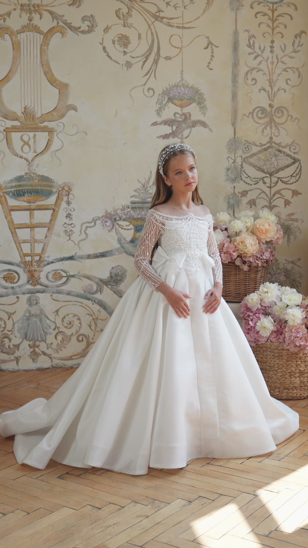 The PENTELEI 3823 Dress is a daring kids’ dress featuring a strapless neckline layered with a sheer illusion overlay, beautifully enhanced by elegant beading. Two medium side bows at the waist add a playful yet bold touch, creating a striking look that’s perfect for special occasions.