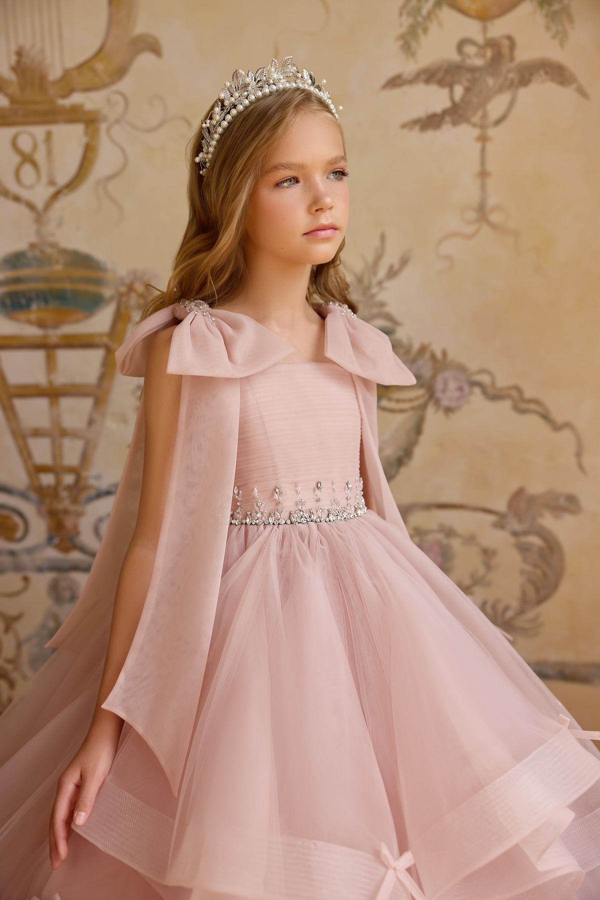 The PENTELEI 3826 Dress is a playful kids’ dress featuring a sweet square neckline and a ruffled skirt adorned with tiny bows for an extra touch of charm. Two medium bows at the waist and one on each strap add delightful accents, while subtle beading adds just the right sparkle to complete this enchanting look—perfect for any special occasion.