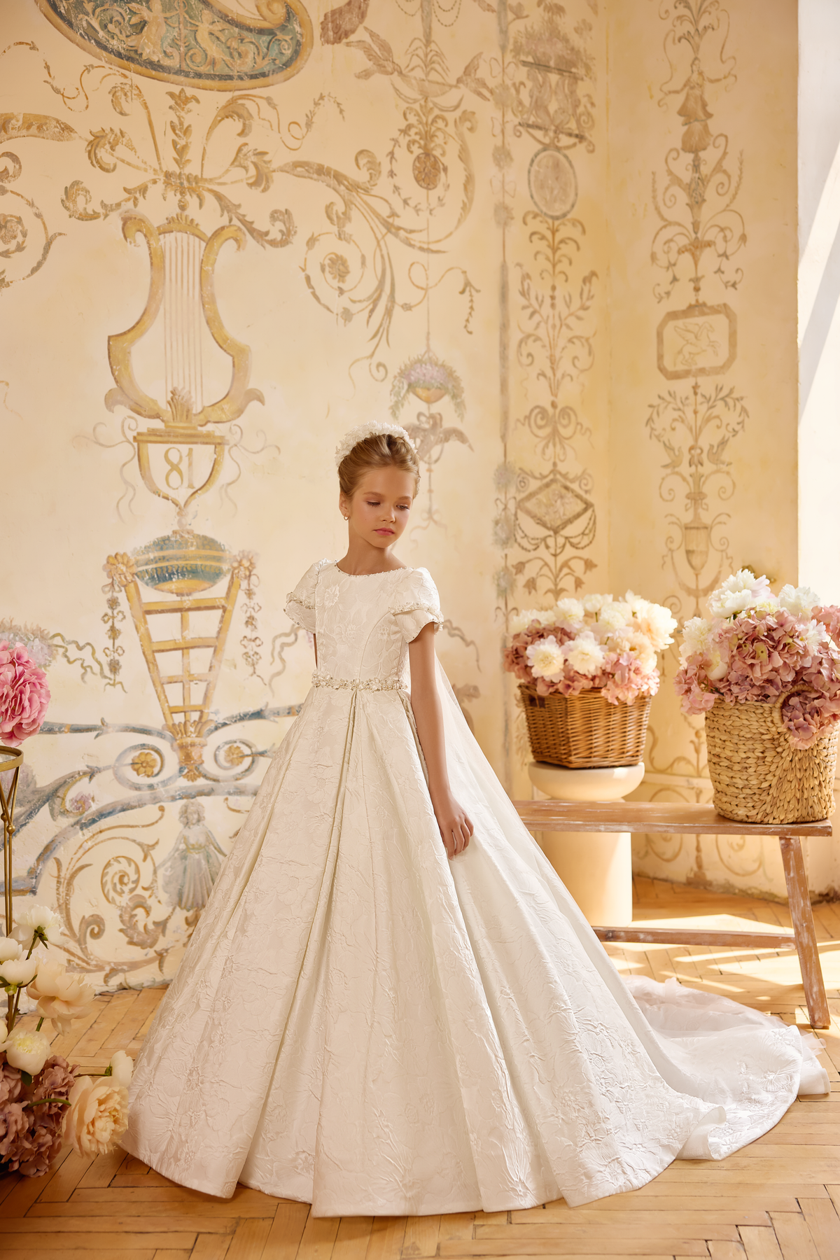 The PENTELEI 3836 Dress is a playful kids’ gown featuring a regal ball gown silhouette crafted from luxurious jacquard fabric adorned with elegant floral patterns. The fitted bodice includes short puff sleeves for a classic touch, while a delicately embellished waistline adds charm. A long flowing skirt with structured pleats and a sweeping train completes this enchanting ensemble, perfect for making special occasions truly magical.
