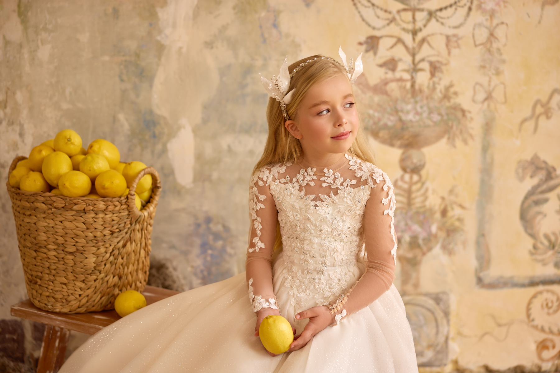 The PENTELEI 3837 Dress is an enchanting gown that makes any young girl feel like a true princess. It features a fitted bodice adorned with delicate floral lace appliqués extending into sheer long sleeves for a graceful touch. The illusion neckline adds elegance, while the intricate lace detailing on the back flows seamlessly into a full, voluminous tulle ballgown skirt. Finished with a dreamy train, this dress is perfect for twirling and making a grand, fairytale-worthy entrance at any special occasion.