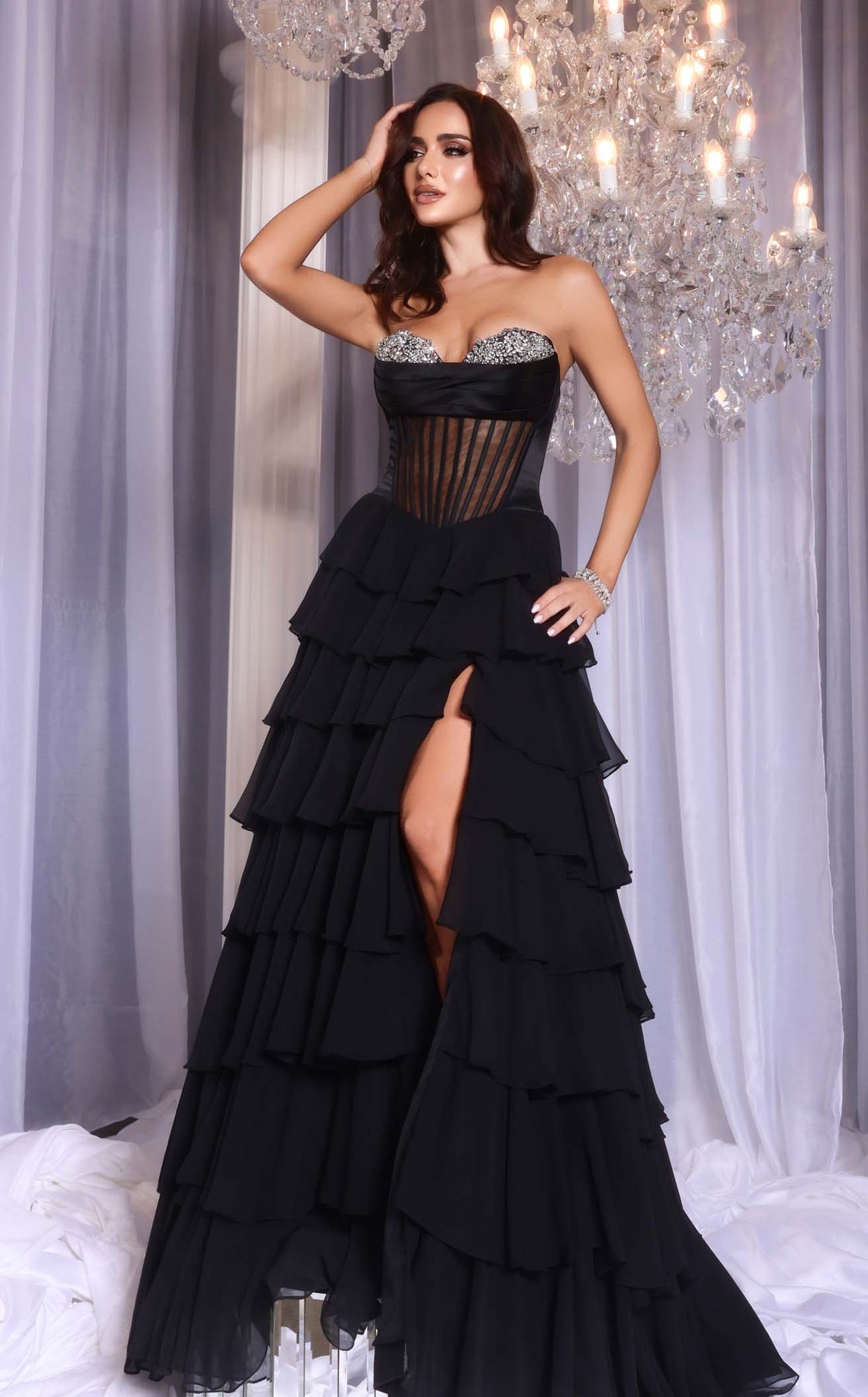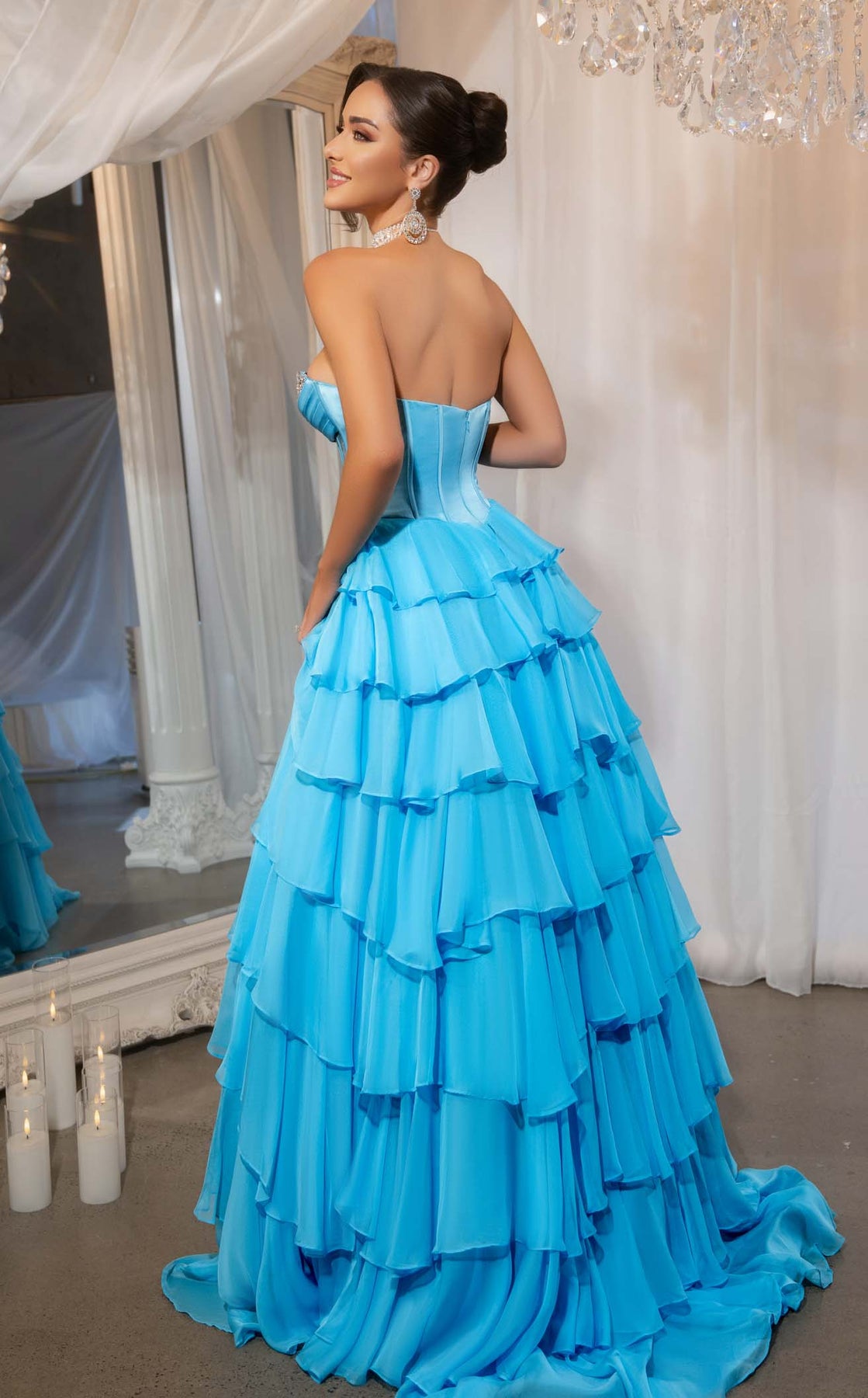 Expertly designed by Portia and Scarlett, the PS25961 Dress is a showstopper. The off shoulder style and high slit add a touch of glamour, while the open back and layered skirt create a stunning silhouette. Perfect for any special occasion, this dress will make you feel confident and beautiful.