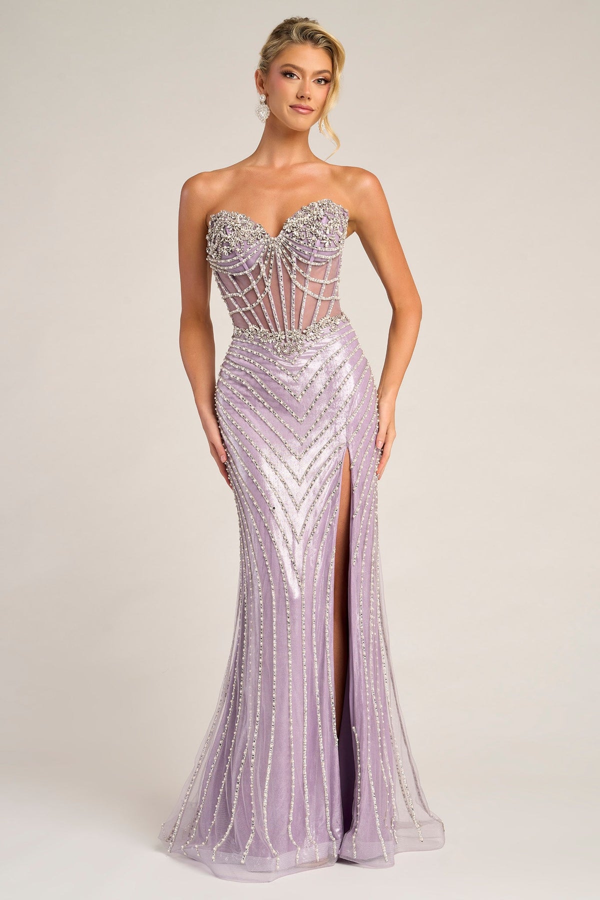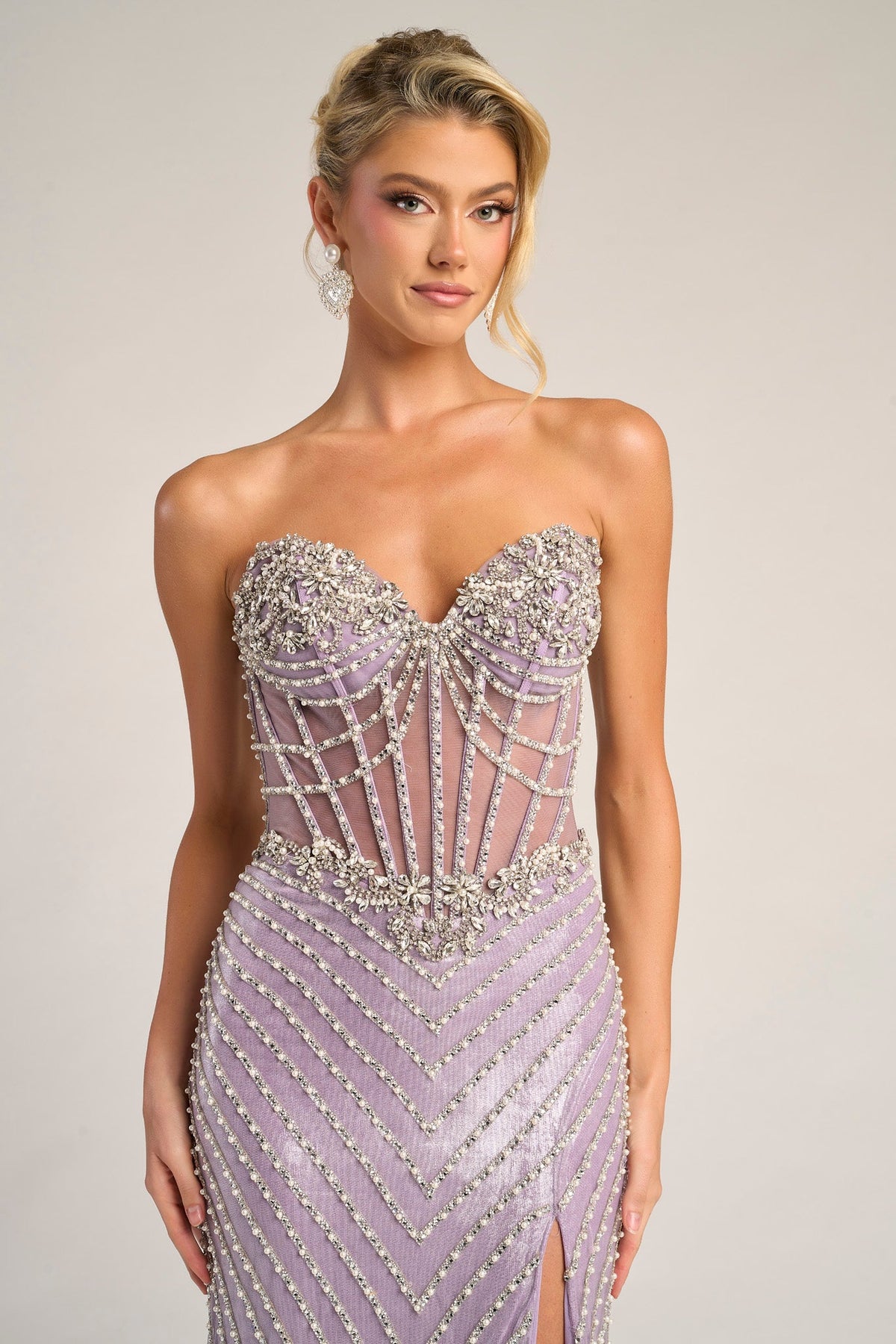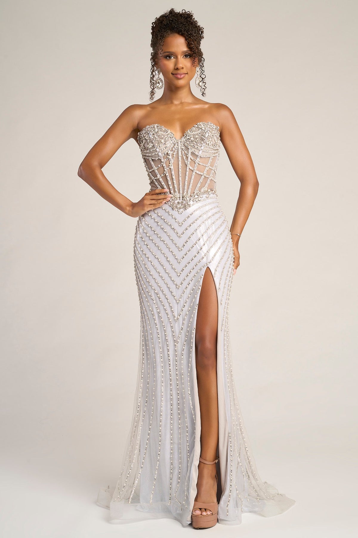 Make a statement in the Portia & Scarlett XO057, a stunning strapless gown that combines architectural elegance with captivating glamour. The sheer corset bodice features exposed boning and intricate beadwork that catches every light, while cascading linear embellishments flow down the fitted skirt to beautifully elongate your silhouette. A daring thigh-high slit adds movement and allure, while the lace-up back ensures a personalized fit that supports and flatters. Perfect for those unforgettable moments when you want to feel confident, radiant, and absolutely breathtaking.
