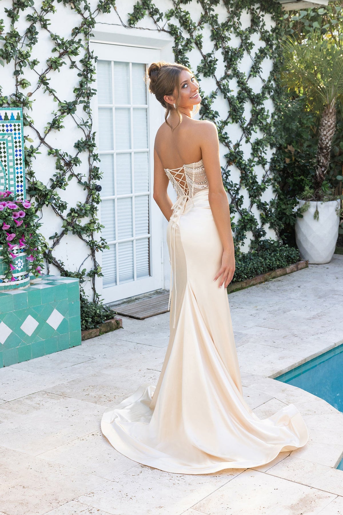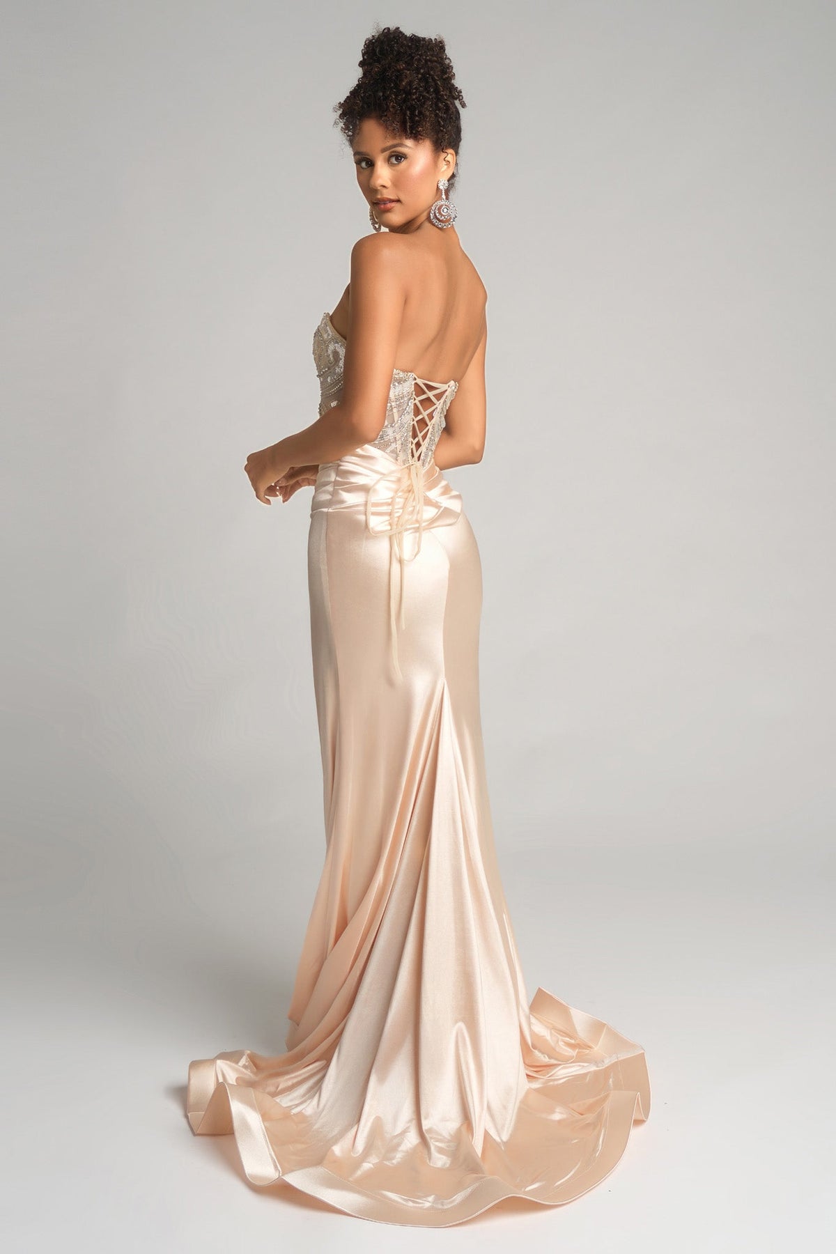 Portia & Scarlett XO065 Dress Elevate your evening with this stunning gown that seamlessly merges timeless elegance with contemporary style. The fitted satin skirt drapes beautifully while the structured corset bodice provides confident support and a flattering silhouette. Intricate sparkling embellishments catch the light with every movement, while strategic ruching at the waist enhances your natural curves. The dramatic thigh-high slit adds modern flair and freedom of movement, and the lace-up back detail offers both visual interest and adjustable comfort. Perfect for special occasions where you want to feel both powerful and radiant.