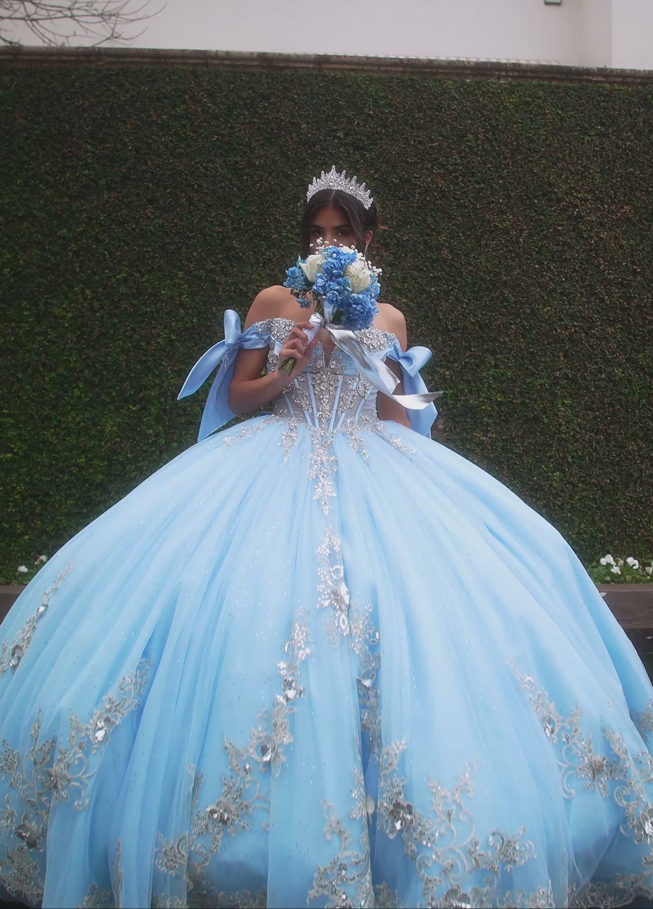 Step out and steal every gaze with the Rachel Allan RQ3155 Dress. Available in dazzling Red Gold, Blush Rose Gold, or Cloud Blue Silver, this ballgown sparkles with glitter tulle and smooth crystal satin. Adorned with 3D floral appliqués, shimmering beading, and a detachable bow, it’s pure magic. The corset-style bodice and full skirt add a royal flair perfect for quinceañeras, galas, or pageants where you’re meant to shine.