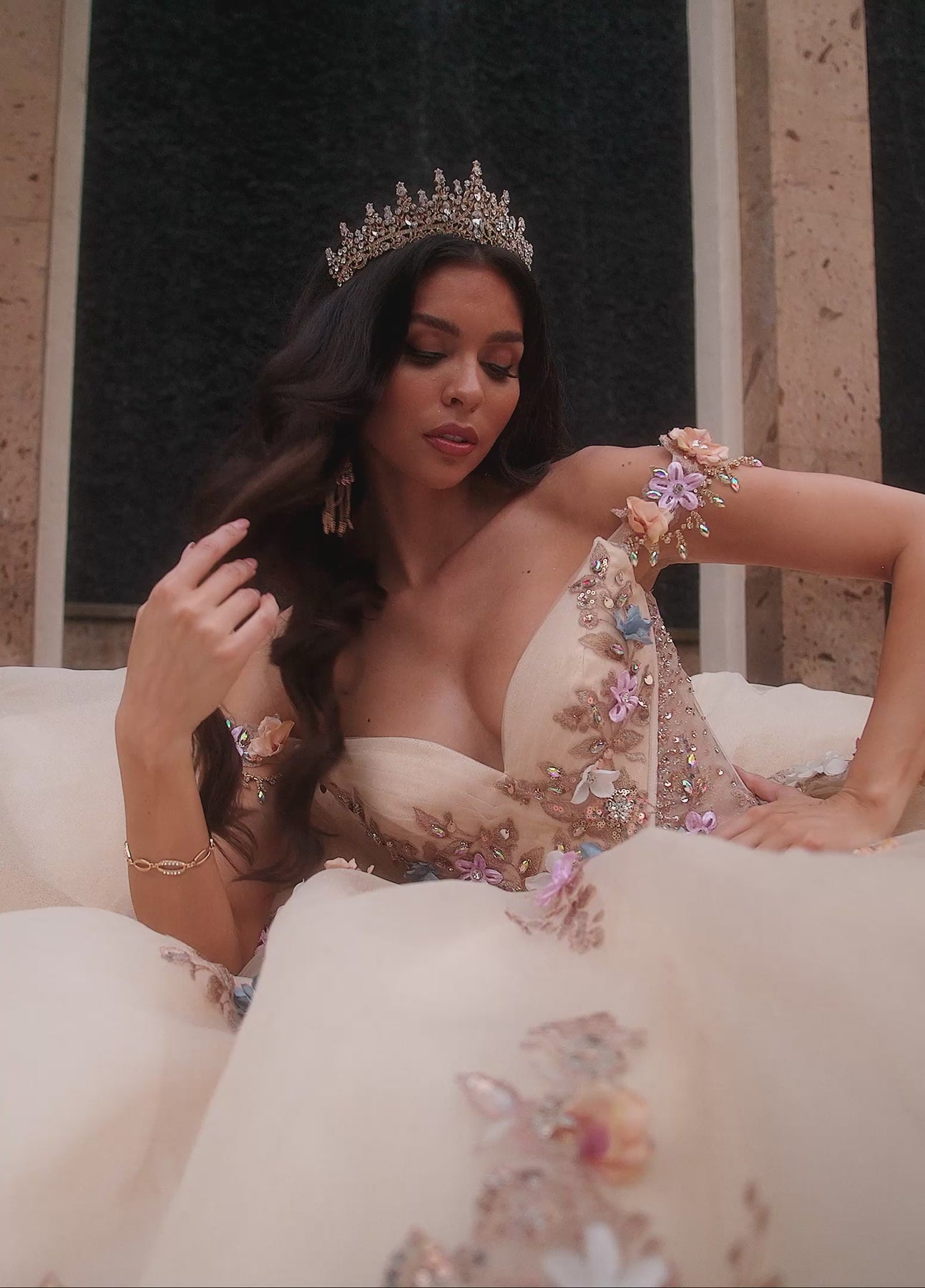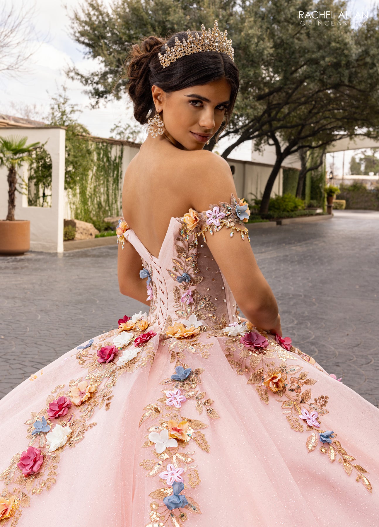 Step into a dream with the Rachel Allan RQ6000 Dress, available in Blush Multi or Champagne Multi. Layers of glitter tulle shimmer beneath vibrant 3D floral appliqués and sparkling beads that cascade down a full, ruffled skirt. Its romantic sweetheart neckline and detachable bodice liner let you tailor your look for an unforgettable quinceañera or grand entrance. This gown turns every moment into a fairytale celebration.