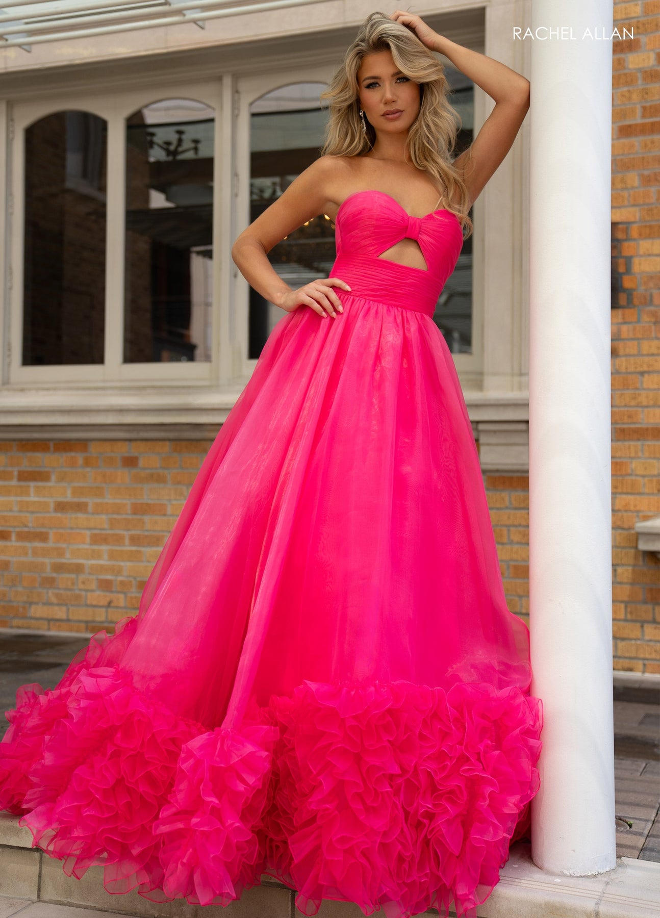 Step into the spotlight with the Rachel Allan 70820 Dress, a daring organza gown designed to captivate. Featuring an A-line ruffled skirt and vibrant chevron beading on stretch tulle, this strapless gown delivers bold elegance. The plunging neckline, lace-up back, and thigh-high slit add an irresistible edge, perfect for unforgettable nights at prom, galas, or red carpet events. Available in hot pink and lime, and sized 00 to 12, this dress promises to make a statement wherever you go.