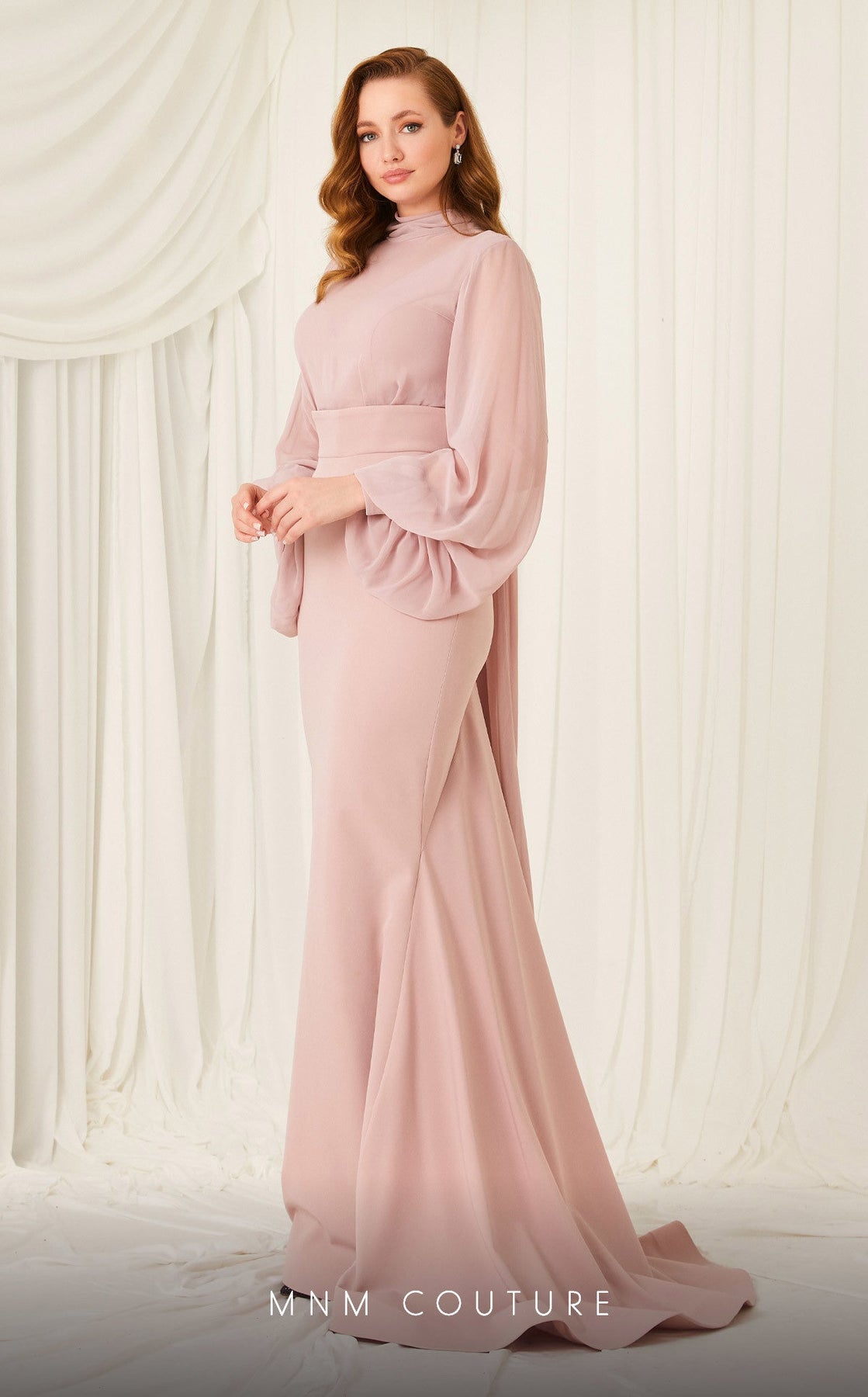 Experience poise and sophistication with the MNM Couture 2637B. This long mermaid gown crafted from crepe and chiffon highlights a refined illusion high neckline that creates a striking silhouette. The full back design elegantly contrasts with the flowing sweep train for a look that is both modest and alluring. Ideal for gala nights, formal dinners, or exclusive evening occasions.