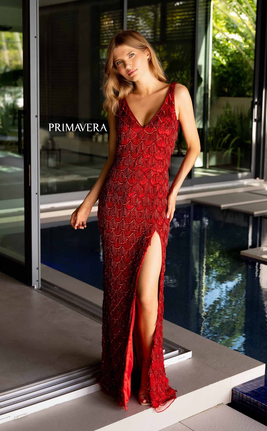 Unleash your confidence with our Primavera 4129 dress. Perfect for prom or evenings, this elegant long dress features a stunning V neckline, sleeveless design, and a unique open back with a stylish slit. The beautiful beaded detailing adds a special touch to this one-of-a-kind dress. Get ready to turn heads and feel amazing in our Primavera dress.